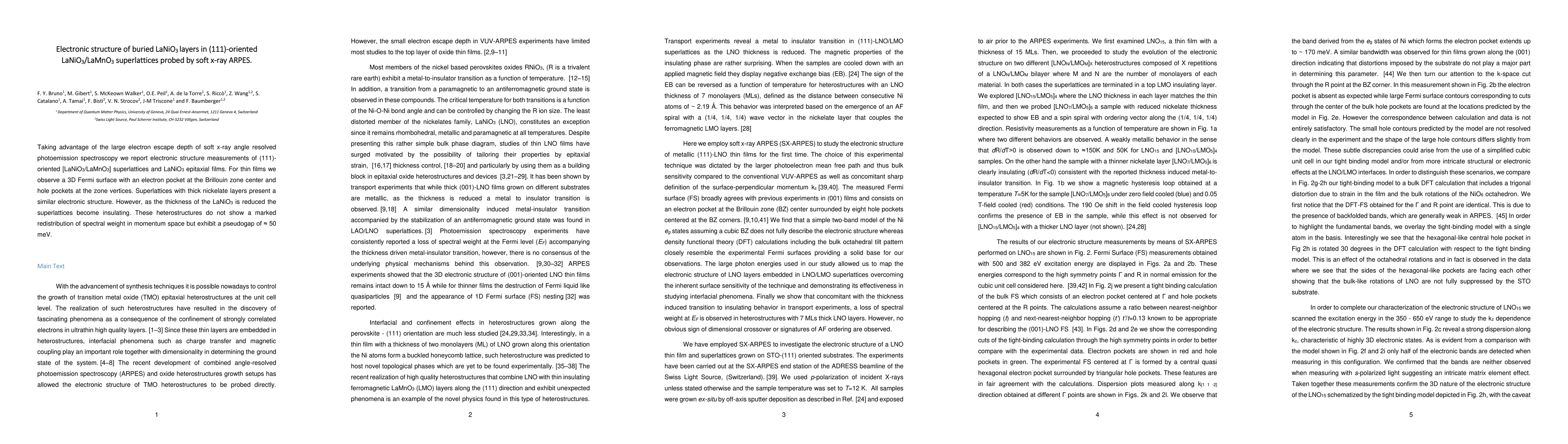 This study uses soft x-ray ARPES to examine the electronic structure of buried LaNiO3 layers in LaNiO3/LaMnO3 superlattices, revealing a 3D Fermi surface with distinct electron and hole pockets. As LaNiO3 thickness decreases, the superlattices transition to insulating behavior with a 50 meV pseudogap.