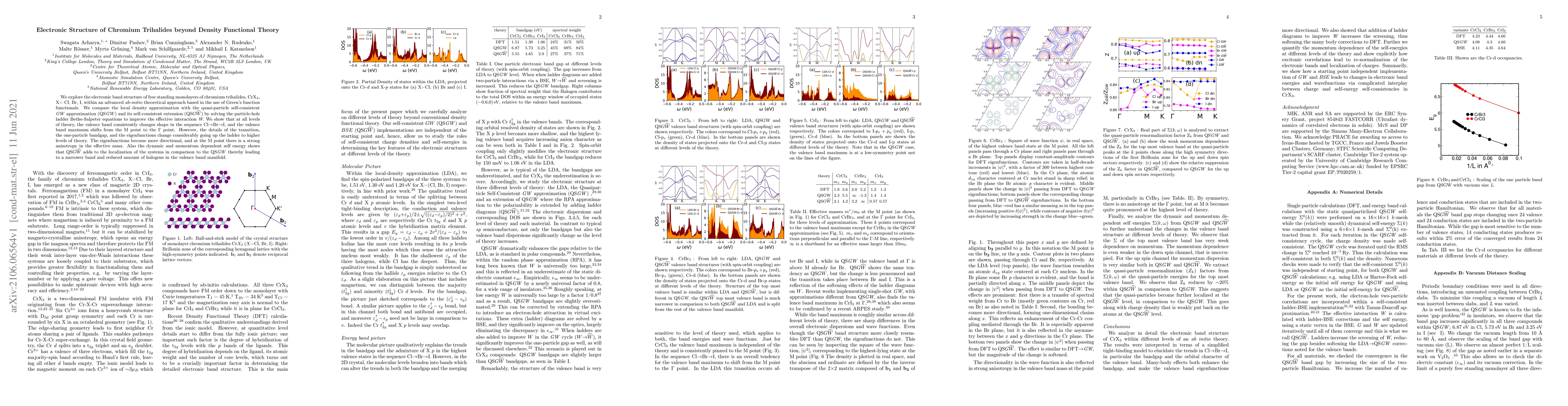 This paper investigates the electronic band structure of monolayer chromium trihalides (CrX₃, X=Cl, Br, I) using advanced ab-initio methods beyond density functional theory. It finds that while the valence band shape changes consistently across halide types, the bandgap and eigenfunctions vary significantly with the level of theory, with QS$G\widehat{W}$ showing stronger localization and anisotropy.