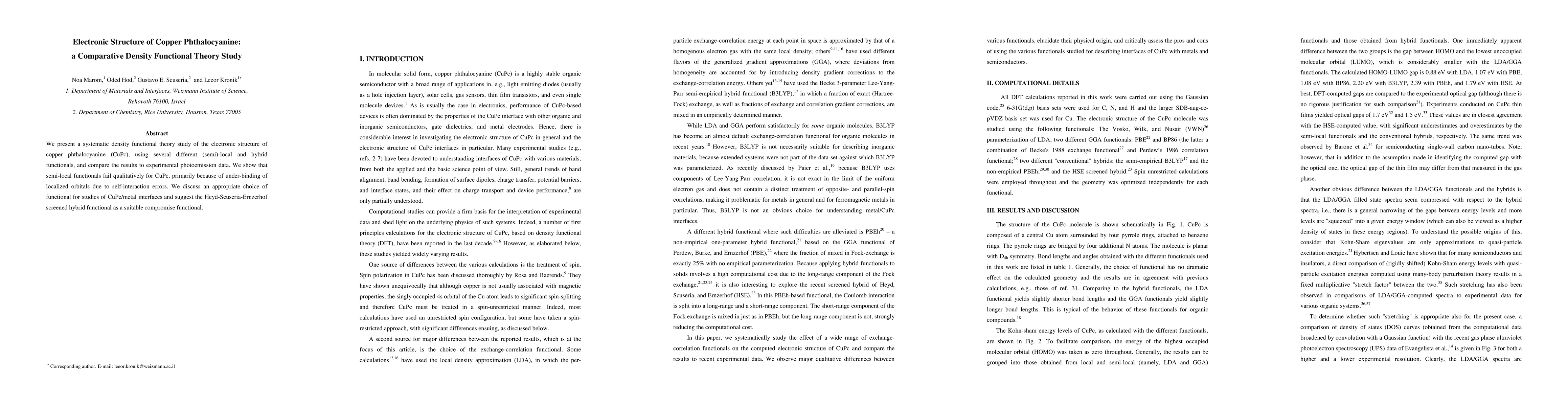 This paper systematically evaluates the electronic structure of copper phthalocyanine (CuPc) using density functional theory, finding that semi-local functionals are inadequate due to self-interaction errors. The Heyd-Scuseria-Ernzerhof hybrid functional is recommended for CuPc/metal interface studies.