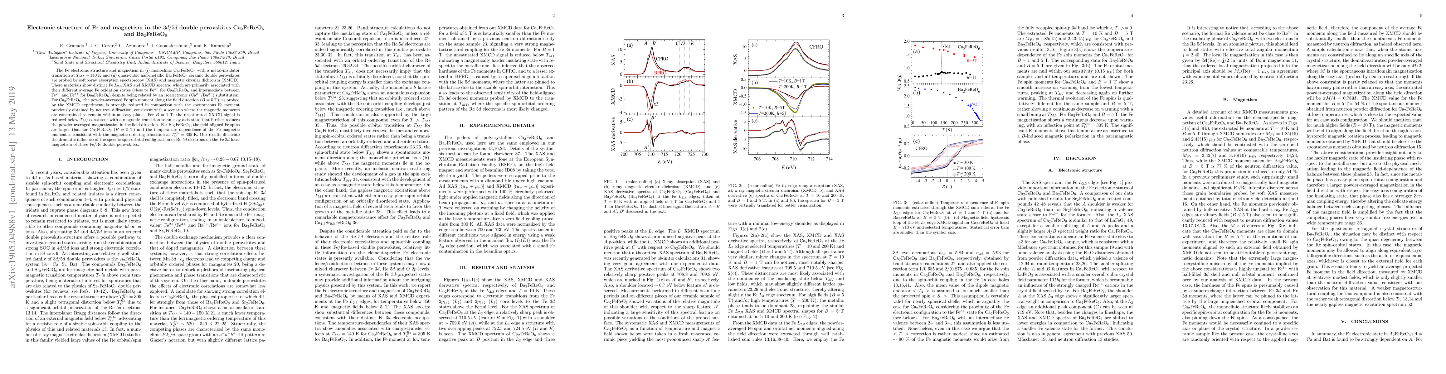 The Fe electronic structure and magnetism in (i) monoclinic Ca$_2$FeReO$_6$ with a metal-insulator transition at $T_{MI} \sim 140$ K and (ii) quasi-cubic half-metallic Ba$_2$FeReO$_6$ ceramic double perovskites are probed by soft x-ray absorption spectroscopy (XAS) and magnetic circular dichroism (XMCD). These materials show distinct Fe $L_{2,3}$ XAS and XMCD spectra, which are primarily associated with their different average Fe oxidation states (close to Fe$^{3+}$ for Ca$_2$FeReO$_6$ and intermediate between Fe$^{2+}$ and Fe$^{3+}$ for Ba$_2$FeReO$_6$) despite being related by an isoelectronic (Ca$^{2+}$/Ba$^{2+}$) substitution. For Ca$_2$FeReO$_6$, the powder-averaged Fe spin moment along the field direction ($B = 5$ T), as probed by the XMCD experiment, is strongly reduced in comparison with the spontaneous Fe moment previously obtained by neutron diffraction, consistent with a scenario where the magnetic moments are constrained to remain within an easy plane. For $B=1$ T, the unsaturated XMCD signal is reduced below $T_{MI}$ consistent with a magnetic transition to an easy-axis state that further reduces the powder-averaged magnetization in the field direction. For Ba$_2$FeReO$_6$, the field-aligned Fe spins are larger than for Ca$_2$FeReO$_6$ ($B=5$ T) and the temperature dependence of the Fe magnetic moment is consistent with the magnetic ordering transition at $T_C^{Ba} = 305$ K. Our results illustrate the dramatic influence of the specific spin-orbital configuration of Re $5d$ electrons on the Fe $3d$ local magnetism of these Fe/Re double perovskites.