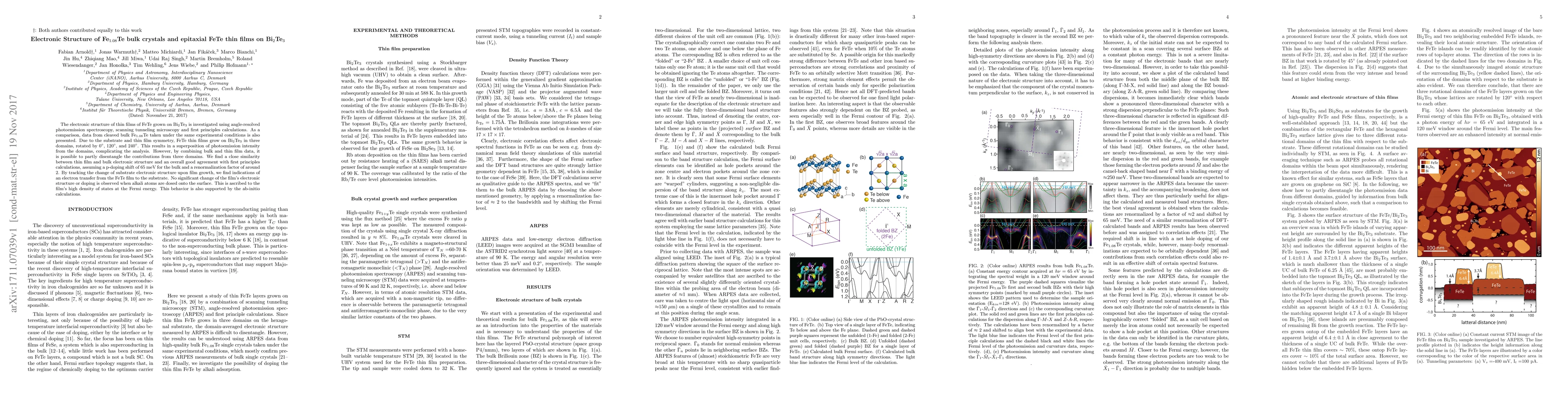 This study investigates the electronic structure of FeTe thin films on Bi$_2$Te$_3$ substrates using angle-resolved photoemission spectroscopy and scanning tunneling microscopy, comparing it to bulk FeTe. The films grow in three rotated domains, complicating analysis but allowing for partial disentanglement through combined data. Results show close similarity between thin film and bulk structures, with minor electron transfer from the film to the substrate, and no significant doping changes upon alkali dosing due to the film's high density of states at the Fermi level.