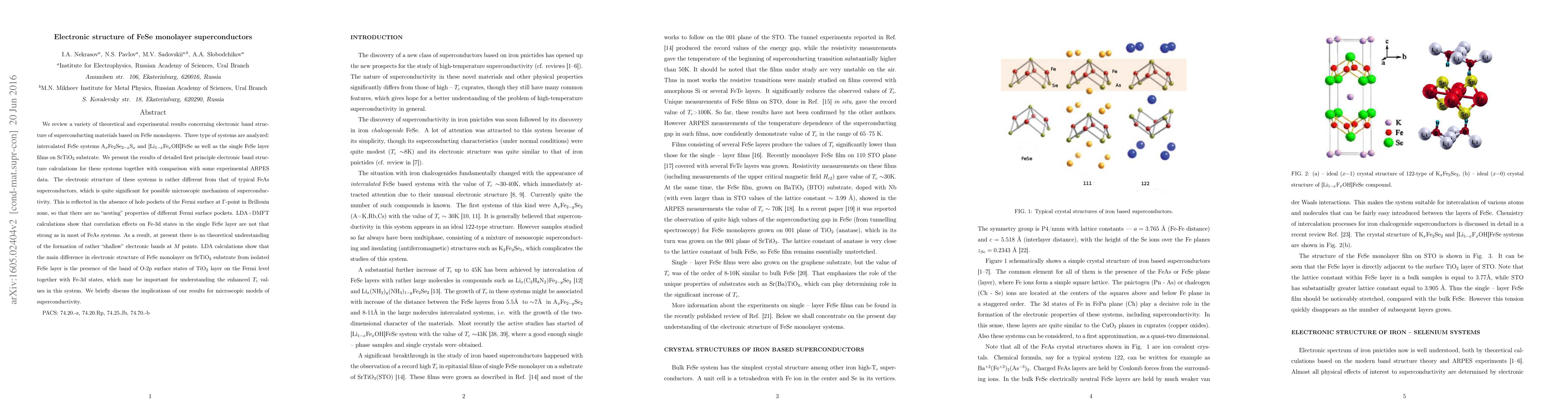 We review a variety of theoretical and experimental results concerning electronic band structure of superconducting materials based on FeSe monolayers. Three type of systems are analyzed: intercalated FeSe systems A_xFe_2Se_{2-x}S_x and [Li_{1-x}Fe_xOH]FeSe as well as the single FeSe layer films on SrTiO_3 substrate. We present the results of detailed first principle electronic band structure calculations for these systems together with comparison with some experimental ARPES data. The electronic structure of these systems is rather different from that of typical FeAs superconductors, which is quite significant for possible microscopic mechanism of superconductivity. This is reflected in the absence of hole pockets of the Fermi surface at \Gamma-point in Brillouin zone, so that there are no "nesting" properties of different Fermi surface pockets. LDA+DMFT calculations show that correlation effects on Fe-3d states in the single FeSe layer are not that strong as in most of FeAs systems. As a result, at present there is no theoretical understanding of the formation of rather "shallow" electronic bands at M points. LDA calculations show that the main difference in electronic structure of FeSe monolayer on SrTiO_3 substrate from isolated FeSe layer is the presence of the band of O-2p surface states of TiO_2 layer on the Fermi level together with Fe-3d states, which may be important for understanding the enhanced T_c values in this system. We briefly discuss the implications of our results for microscopic models of superconductivity.