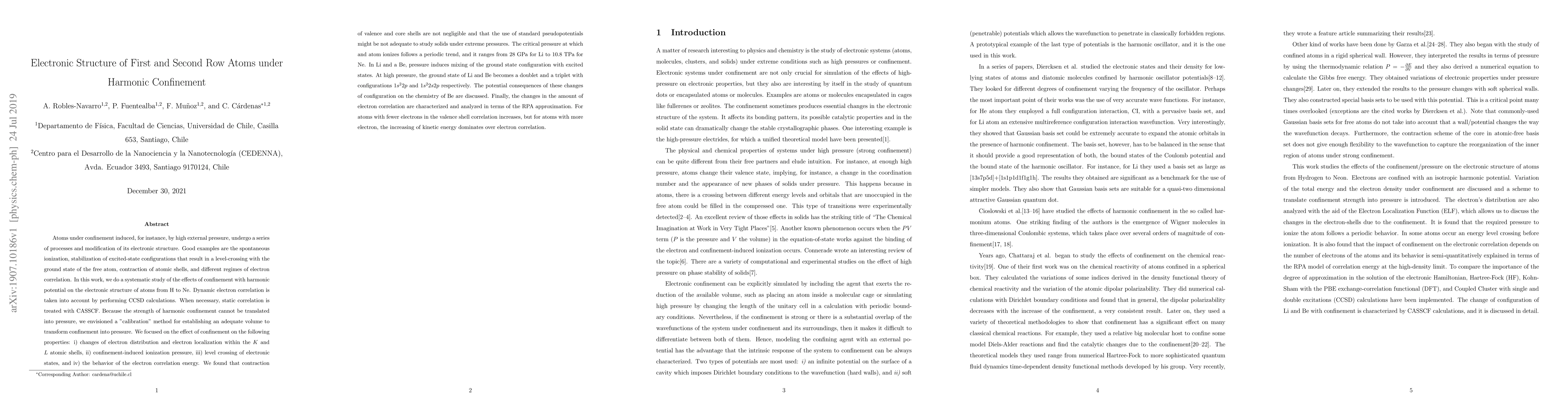 Atoms under pressure undergo a series of processes and modification of its electronic structure. Examples are the spontaneous ionization, stabilization of excited-state configurations that result in a level-crossing with the ground state of the free atom, and contraction of atomic shells. In this work, we do a systematic study of the effects of confinement with harmonic potential on the electronic structure of atoms from H to Ne. Dynamic and static correlation is taken into account by performing CCSD and CASSCF calculations, respectively. Because the strength of harmonic confinement cannot be translated into pressure, we envisioned a "calibration" method to transform confinement into pressure. We focused on the effect of confinement on: i) changes of electron distribution and localization within the $K$ and $L$ atomic shells, ii) confinement-induced ionization pressure, iii) level crossing of electronic states, and iv) the electron correlation energy. We found that contraction of valence and core shells are not negligible and that the use of standard pseudopotentials might be not adequate to study solids under extreme pressures. The critical pressure at which and atom ionizes follows a periodic trend, and it ranges from $28$ GPa for Li to $10.8$ TPa for Ne. In Li and a Be, pressure induces mixing of the ground state configuration with excited states. At high pressure, the ground state of Li and Be becomes a doublet and a triplet with configurations $1s^22p$ and $1s^22s2p$ respectively. The potential consequences of these changes of configuration on the chemistry of Be are discussed. Finally, the changes in the amount of electron correlation are characterized and analyzed in terms of the RPA approximation. For atoms with fewer electrons in the valence shell correlation increases, but for atoms with more electron, the increasing of kinetic energy dominates over electron correlation.