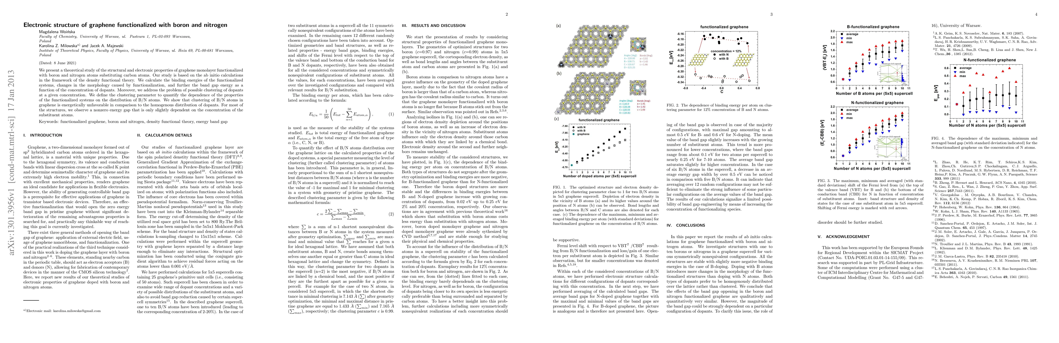 This paper investigates the electronic structure of graphene functionalized with boron and nitrogen atoms using density functional theory. It finds that homogeneous distribution of dopants is more favorable than clustering, and that the functionalized graphene exhibits a nonzero band gap that is only slightly affected by dopant concentration.