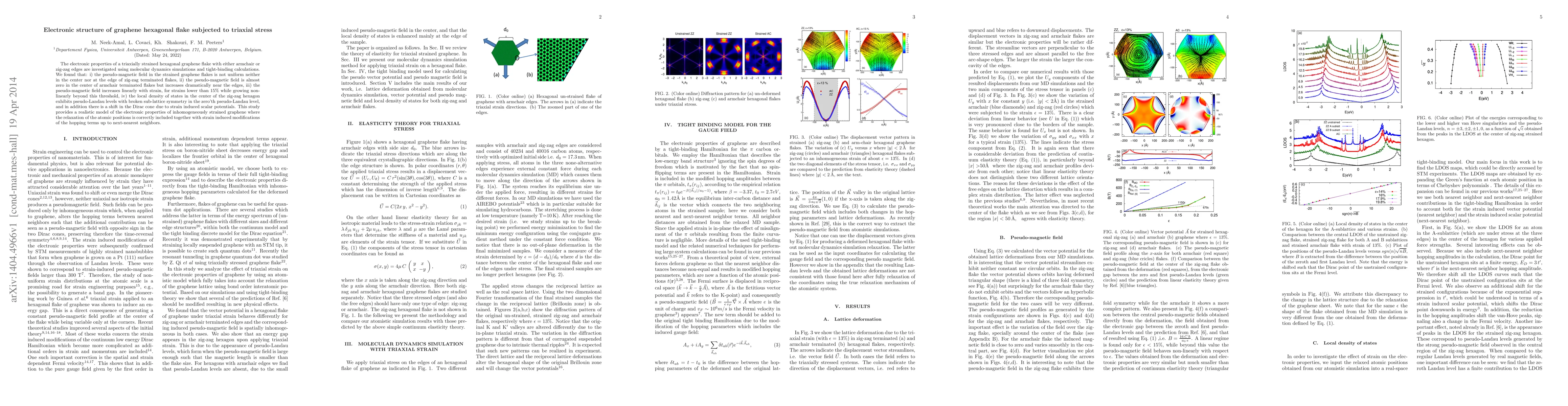 The electronic properties of a triaxially strained hexagonal graphene flake with either armchair or zig-zag edges are investigated using molecular dynamics simulations and tight-binding calculations. We found that: i) the pseudo-magnetic field in the strained graphene flakes is not uniform neither in the center nor at the edge of zig-zag terminated flakes, ii) the pseudo-magnetic field is almost zero in the center of armchair terminated flakes but increases dramatically near the edges, iii) the pseudo-magnetic field increases linearly with strain, for strains lower than 15$%$ while growing non-linearly beyond this threshold, iv) the local density of states in the center of the zig-zag hexagon exhibits pseudo-Landau levels with broken sub-lattice symmetry in the zero'th pseudo-Landau level, and in addition there is a shift in the Dirac cone due to strain induced scalar potentials. This study provides a realistic model of the electronic properties of inhomogeneously strained graphene where the relaxation of the atomic positions is correctly included together with strain induced modifications of the hopping terms up to next-nearest neighbors.