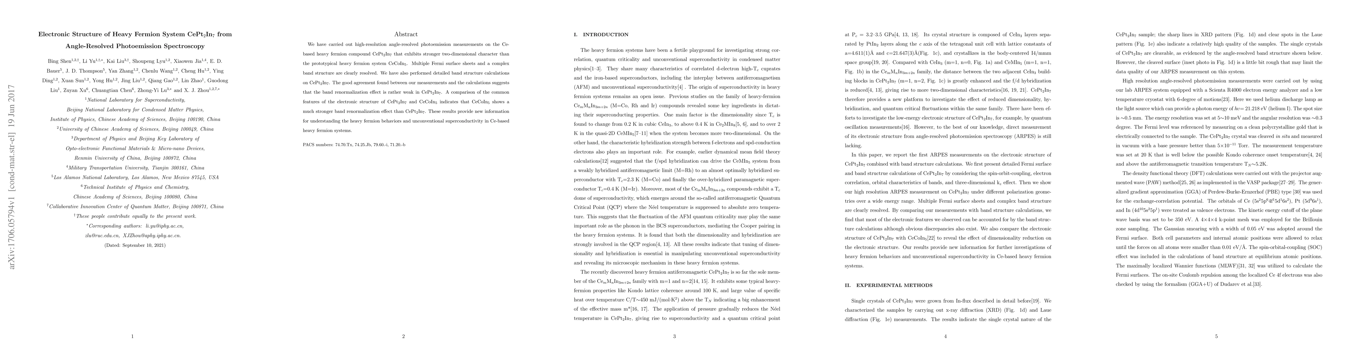 We have carried out high-resolution angle-resolved photoemission measurements on the Cebased heavy fermion compound CePt2In7 that exhibits stronger two-dimensional character than the prototypical heavy fermion system CeCoIn5. Multiple Fermi surface sheets and a complex band structure are clearly resolved. We have also performed detailed band structure calculations on CePt2In7. The good agreement found between our measurements and the calculations suggests that the band renormalization effect is rather weak in CePt2In7. A comparison of the common features of the electronic structure of CePt2In7 and CeCoIn5 indicates that CeCoIn5 shows a much stronger band renormalization effect than CePt2In7. These results provide new information for understanding the heavy fermion behaviors and unconventional superconductivity in Ce-based heavy fermion systems.