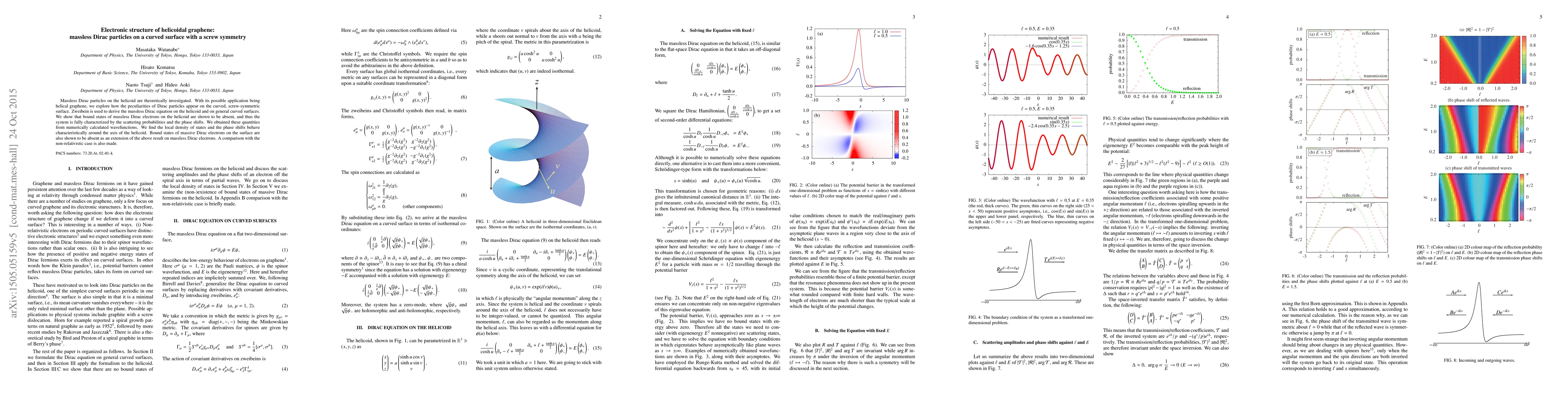 This paper investigates massless Dirac particles on the curved surface of helical graphene, demonstrating that no bound states exist for either massless or massive electrons. The study uses the zweibein to derive the Dirac equation and finds unique local density of states and phase shifts, particularly near the helicoid's axis.
