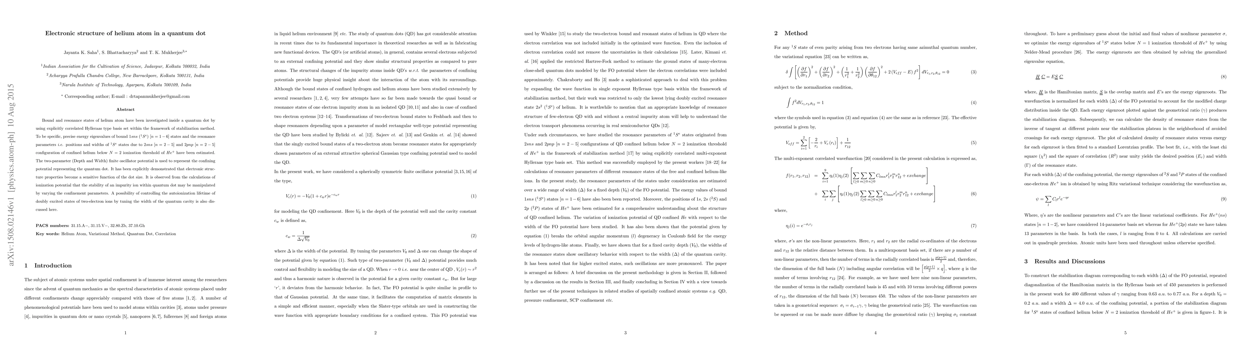 Bound and resonance states of helium atom have been investigated inside a quantum dot by using explicitly correlated Hylleraas type basis set within the framework of stabilization method. To be specific, precise energy eigenvalues of bound 1sns (1Se) [n = 1-6] states and the resonance parameters i.e. positions and widths of 1Se states due to 2sns [n = 2-5] and 2pnp [n = 2-5] configuration of confined helium below N = 2 ionization threshold of He+ have been estimated. The two-parameter (Depth and Width) finite oscillator potential is used to represent the confining potential representing the quantum dot. It has been explicitly demonstrated that electronic structure properties become a sensitive function of the dot size. It is observed from the calculations of ionization potential that the stability of an impurity ion within quantum dot may be manipulated by varying the confinement parameters. A possibility of controlling the autoionization lifetime of doubly excited states of two-electron ions by tuning the width of the quantum cavity is also discussed here.