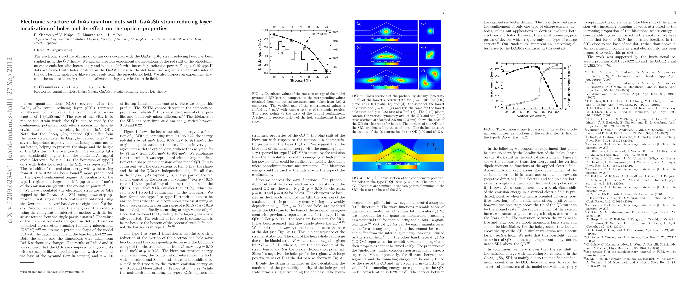 This study investigates the electronic structure of InAs quantum dots with a GaAsSb strain-reducing layer, explaining the red shift in photoluminescence with increasing Sb content and the blue shift with higher excitation power. Holes localize in the GaAsSb region, forming molecular-like states due to piezoelectric field effects.