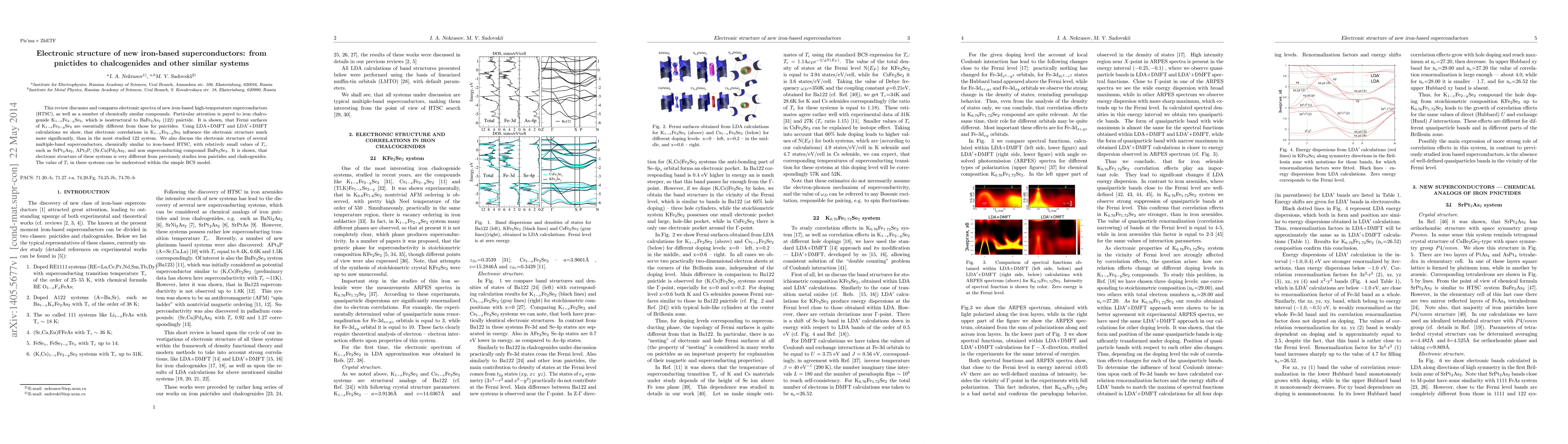This review discusses and compares electronic spectra of new iron-based high-temperature superconductors (HTSC), as well as a number of chemically similar compounds. Particular attention is payed to iron chalcogenide K_{1-x}Fe_{2-y}Se_2, which is isostructural to BaFe_2As_2 (122) pnictide. It is shown, that Fermi surfaces of K_{1-x}Fe_{2-y}Se_2 are essentially different from those for pnictides. Using LDA+DMFT and LDA'+DMFT calculations we show, that electronic correlations in K_{1-x}Fe_{2-y}Se_2 influence the electronic structure much more significantly, than in the most studied 122 system. We also discuss the electronic structure of several multiple-band superconductors, chemically similar to iron-based HTSC, with relatively small values of $T_c$, such as SrPt_{2}As_{2}, APt_{3}P, (Sr,Ca)Pd_2As_2, and non superconducting compound BaFe_2Se_3. It is shown, that electronic structure of these systems is very different from previously studies iron pnictides and chalcogenides. The value of T_c in these systems can be understood within the simple BCS model.