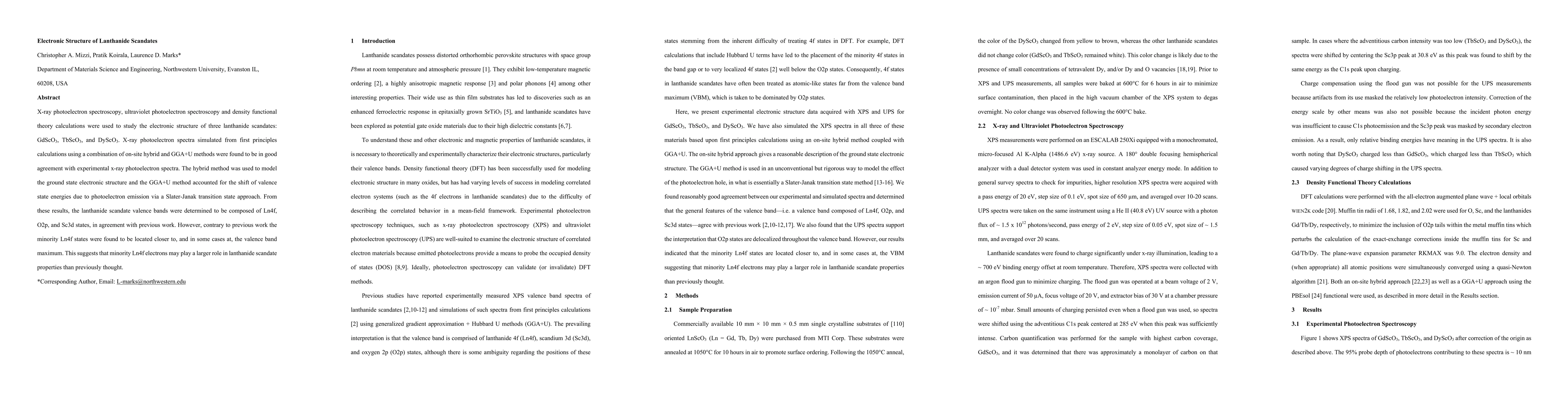 X-ray photoelectron spectroscopy, ultraviolet photoelectron spectroscopy and density functional theory calculations were used to study the electronic structure of three lanthanide scandates: GdScO3, TbScO3, and DyScO3. X-ray photoelectron spectra simulated from first principles calculations using a combination of on-site hybrid and GGA+U methods were found to be in good agreement with experimental x-ray photoelectron spectra. The hybrid method was used to model the ground state electronic structure and the GGA+U method accounted for the shift of valence state energies due to photoelectron emission via a Slater-Janak transition state approach. From these results, the lanthanide scandate valence bands were determined to be composed of Ln4f, O2p, and Sc3d states, in agreement with previous work. However, contrary to previous work the minority Ln4f states were found to be located closer to, and in some cases at, the valence band maximum. This suggests that minority Ln4f electrons may play a larger role in lanthanide scandate properties than previously thought.
