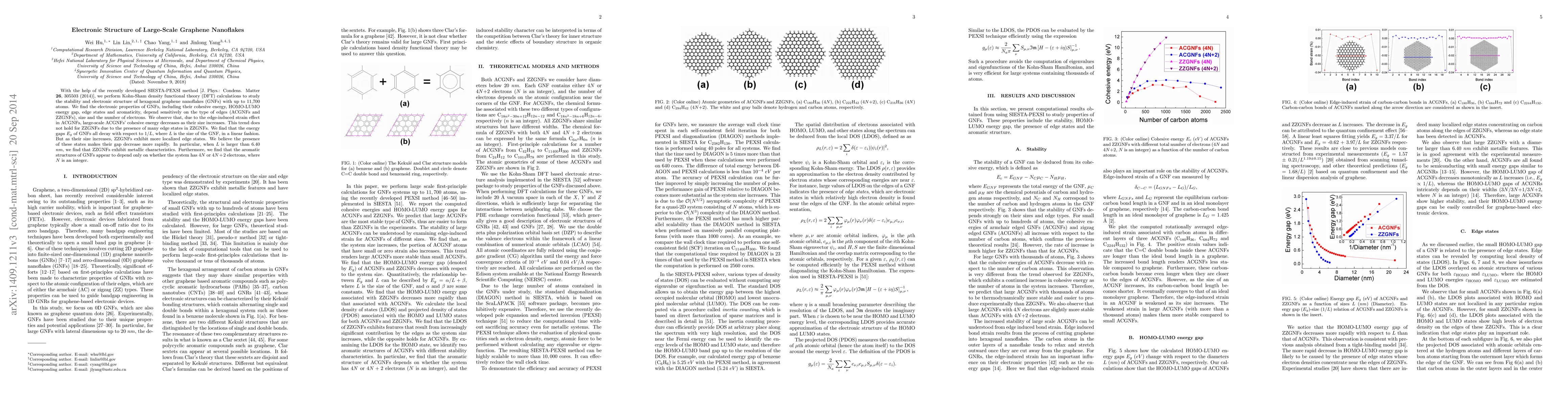 With the help of the recently developed SIESTA-PEXSI method [J. Phys.: Condens. Matter \textbf{26}, 305503 (2014)], we perform Kohn-Sham density functional theory (DFT) calculations to study the stability and electronic structure of hexagonal graphene nanoflakes (GNFs) with up to 11,700 atoms. We find the electronic properties of GNFs, including their cohesive energy, HOMO-LUMO energy gap, edge states and aromaticity, depend sensitively on the type of edges (ACGNFs and ZZGNFs), size and the number of electrons. We observe that, due to the edge-induced strain effect in ACGNFs, large-scale ACGNFs' cohesive energy decreases as their size increases. This trend does not hold for ZZGNFs due to the presence of many edge states in ZZGNFs. We find that the energy gaps $E_g$ of GNFs all decay with respect to $1/L$, where $L$ is the size of the GNF, in a linear fashion. But as their size increases, ZZGNFs exhibit more localized edge states. We believe the presence of these states makes their gap decrease more rapidly. In particular, when $L$ is larger than 6.40 $nm$, we find that ZZGNFs exhibit metallic characteristics. Furthermore, we find that the aromatic structures of GNFs appear to depend only on whether the system has $4N$ or $4N+2$ electrons, where $N$ is an integer.