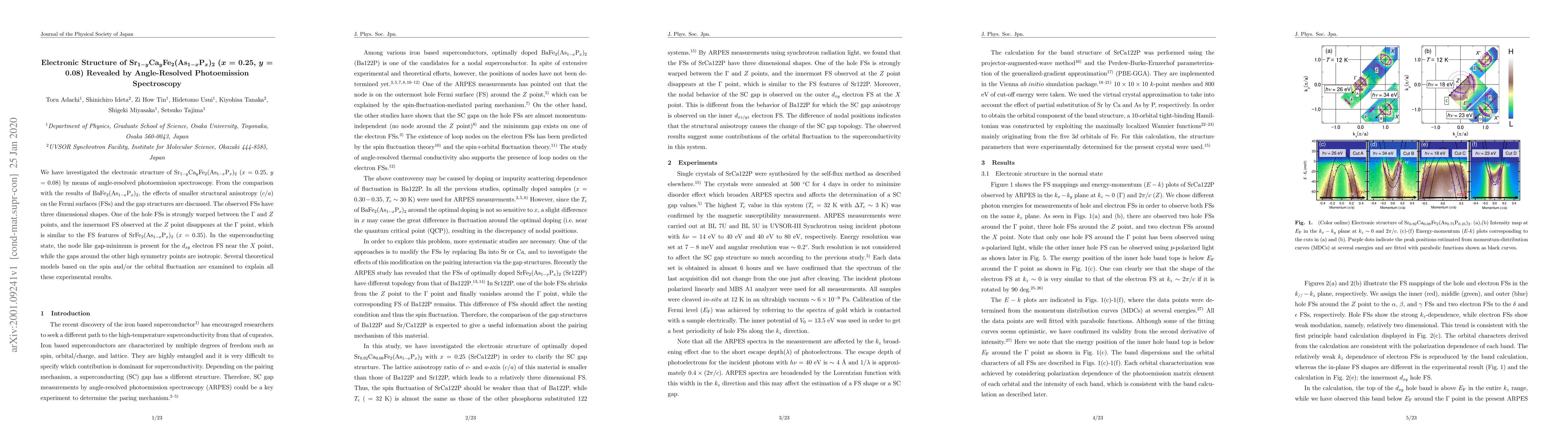 This study uses angle-resolved photoemission spectroscopy to investigate the electronic structure of $\mathrm{Sr}_{1-y}\mathrm{Ca}_{y}\mathrm{Fe_{2}}(\mathrm{As}_{1-x}\mathrm{P}_{x}\mathrm{)_{2}}$ ($x$ = 0.25, $y$ = 0.08), revealing three-dimensional Fermi surfaces and anisotropic gap structures. Theoretical models are proposed to explain the observed electronic features, including a node-like gap minimum in the superconducting state.