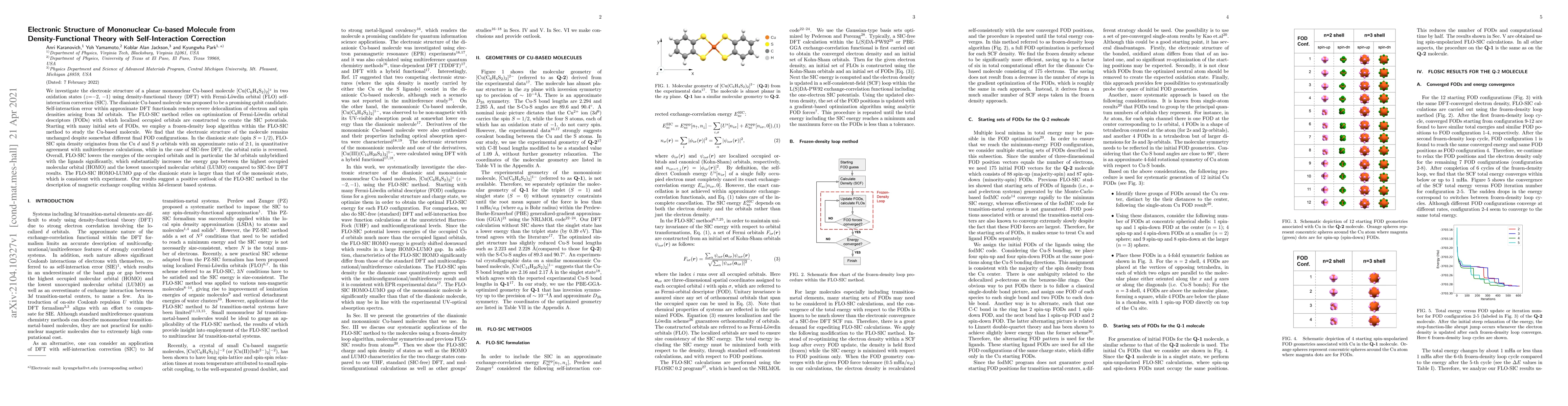 This paper investigates the electronic structure of a planar mononuclear Cu-based molecule using density-functional theory with Fermi-Löwdin orbital self-interaction correction (FLO-SIC). The study finds that FLO-SIC significantly improves the description of the molecule's electronic structure, particularly the energy gap between HOMO and LUMO, aligning better with experimental observations than SIC-free DFT.