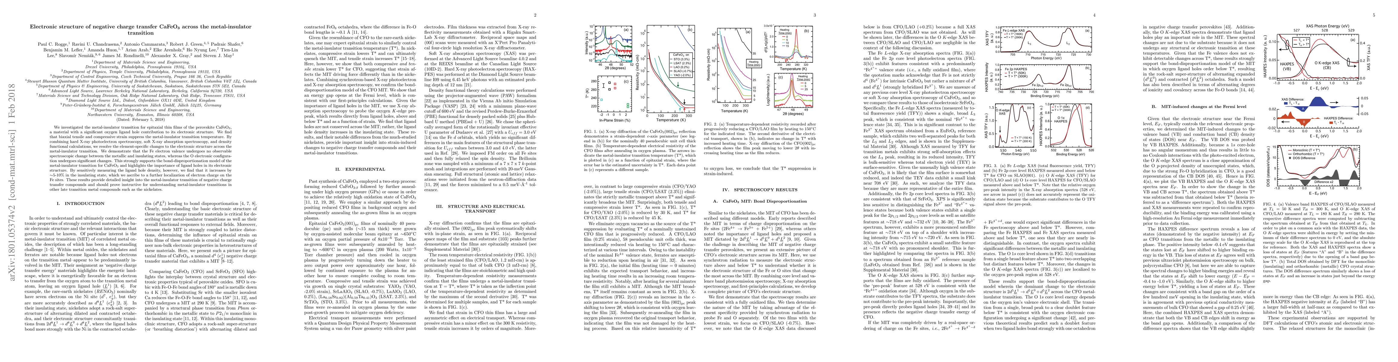 This study investigates the metal-insulator transition in CaFeO3 perovskite thin films, revealing that strain affects the transition temperature. The research shows that while Fe valence remains unchanged, the O electronic configuration significantly alters, supporting the bond-disproportionation model and emphasizing the role of ligand holes in the transition.