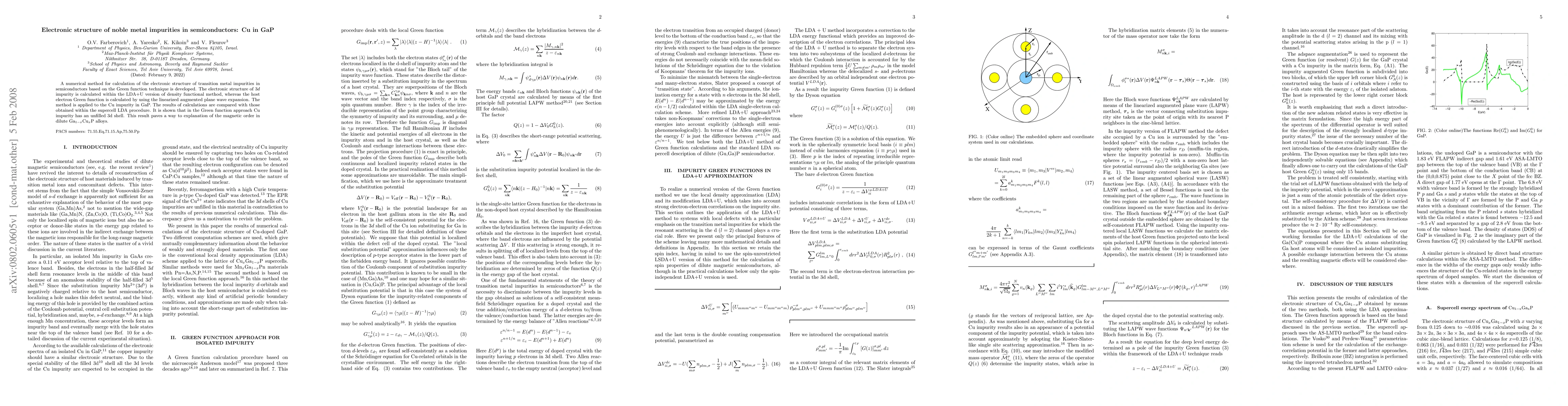 This paper develops a numerical method using Green function techniques to calculate the electronic structure of Cu impurities in GaP, revealing that Cu has an unfilled 3d shell. This finding provides insight into the magnetic order in dilute Ga_{1-x}Cu_xP alloys.