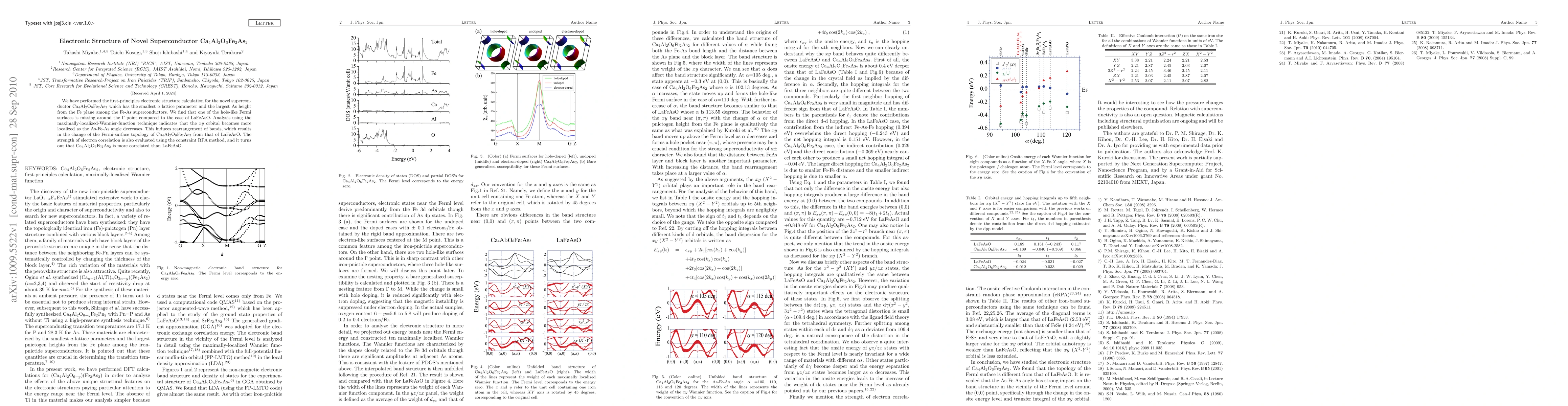 We have performed the first-principles electronic structure calculation for the novel superconductor Ca4Al2O6Fe2As2 which has the smallest a lattice parameter and the largest As height from the Fe plane among the Fe-As superconductors. We find that one of the hole-like Fermi surfaces is missing around the Gamma point compared to the case of LaFeAsO. Analysis using the maximally-localized-Wannier-function technique indicates that the xy orbital becomes more localized as the As-Fe-As angle decreases. This induces rearrangement of bands, which results in the change of the Fermi-surface topology of Ca4Al2O6Fe2As2 from that of LaFeAsO. The strength of electron correlation is also evaluated using the constraint RPA method, and it turns out that Ca4Al2O6Fe2As2 is more correlated than LaFeAsO.