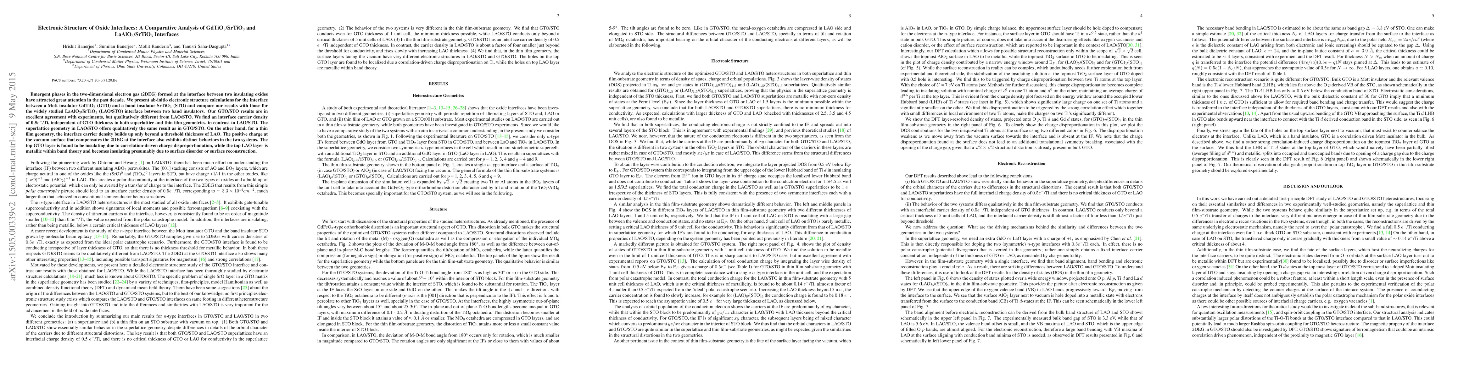 This paper presents ab-initio calculations comparing the electronic structures of GdTiO$_3$/SrTiO$_3$ and LaAlO$_3$/SrTiO$_3$ interfaces, revealing distinct emergent phases and carrier density behaviors, with a notable insulating behavior in GdTiO$_3$ and metallic tendencies in LaAlO$_3$ influenced by surface conditions.