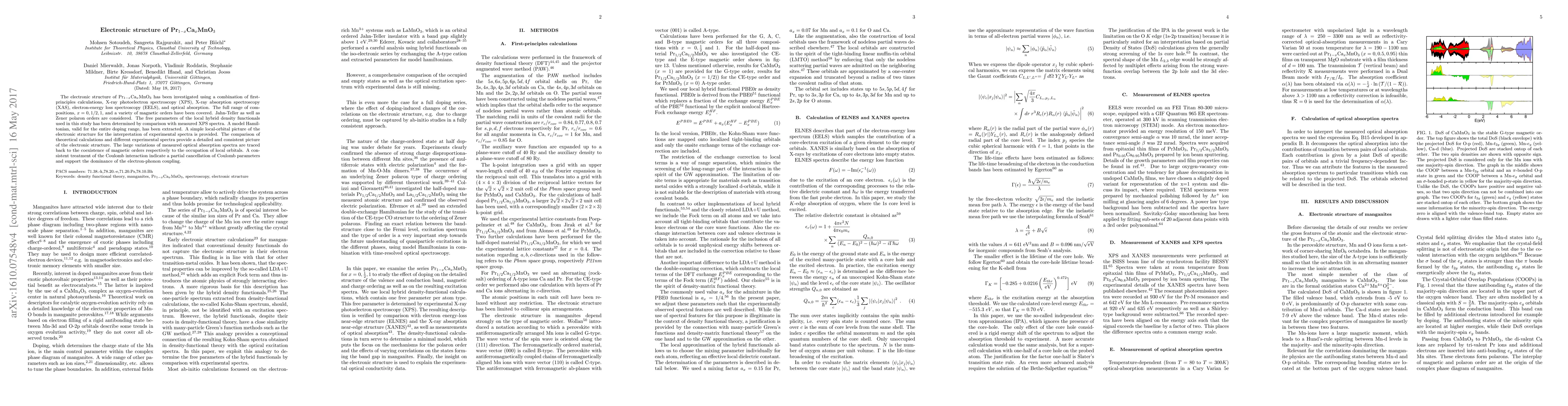 The electronic structure of Pr$_{1-x}$Ca$_x$MnO$_3$ has been investigated using a combination of first-principles calculations, X-ray photoelectron spectroscopy (XPS), X-ray absorption spectroscopy (XAS), electron-energy loss spectroscopy (EELS), and optical absorption. The full range of compositions, $x=0,1/2,1$, and a variety of magnetic orders have been covered. Jahn-Teller as well as Zener polaron orders are considered. The free parameters of the local hybrid density functionals used in this study has been determined by comparison with measured XPS spectra. A model Hamiltonian, valid for the entire doping range, has been extracted. A simple local-orbital picture of the electronic structure for the interpretation of experimental spectra is provided. The comparison of theoretical calculations and different experimental sprectra provide a detailed and consistent picture of the electronic structure. The large variations of measured optical absorption spectra are traced back to the coexistence of magnetic orders respectively to the occupation of local orbitals. A consistent treatment of the Coulomb interaction indicate a partial cancellation of Coulomb parameters and support the dominance of the electron-phonon coupling.