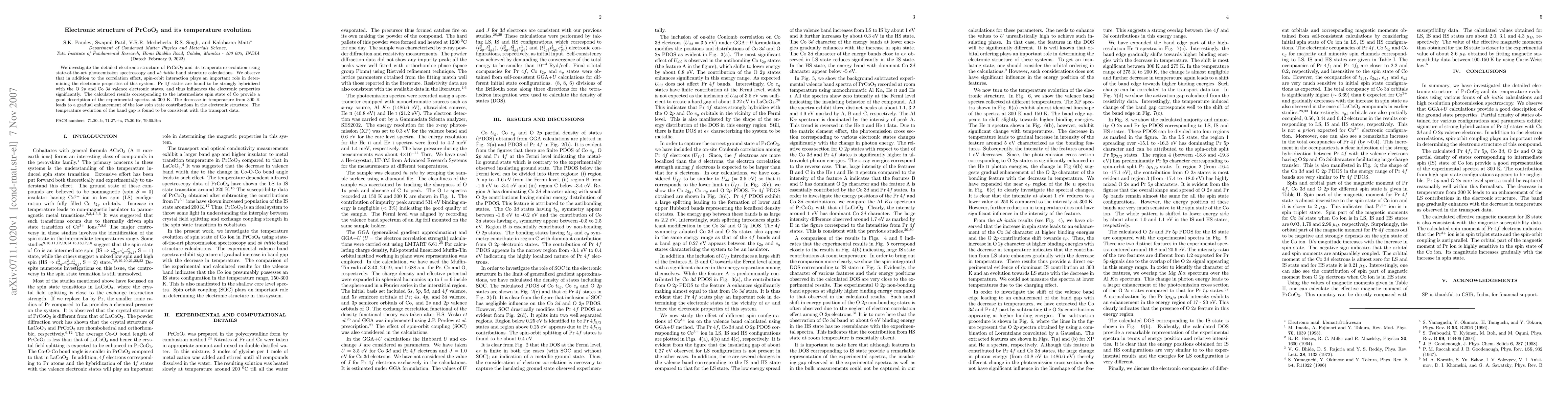 We investigate the detailed electronic structure of PrCoO$_3$ and its temperature evolution using state-of-the-art photoemission spectroscopy and ab initio band structure calculations. We observe that in addition to the correlation effect, spin-orbit interaction plays an important role in determining the electronic properties of this system. Pr 4$f$ states are found to be strongly hybridized with the O 2$p$ and Co 3$d$ valence electronic states, and thus influences the electronic properties significantly. The calculated results corresponding to the intermediate spin state of Co provide a good description of the experimental spectra at 300 K. The decrease in temperature from 300 K leads to a gradual enhancement of the low spin state contributions in the electronic structure. The temperature evolution of the band gap is found to be consistent with the transport data.