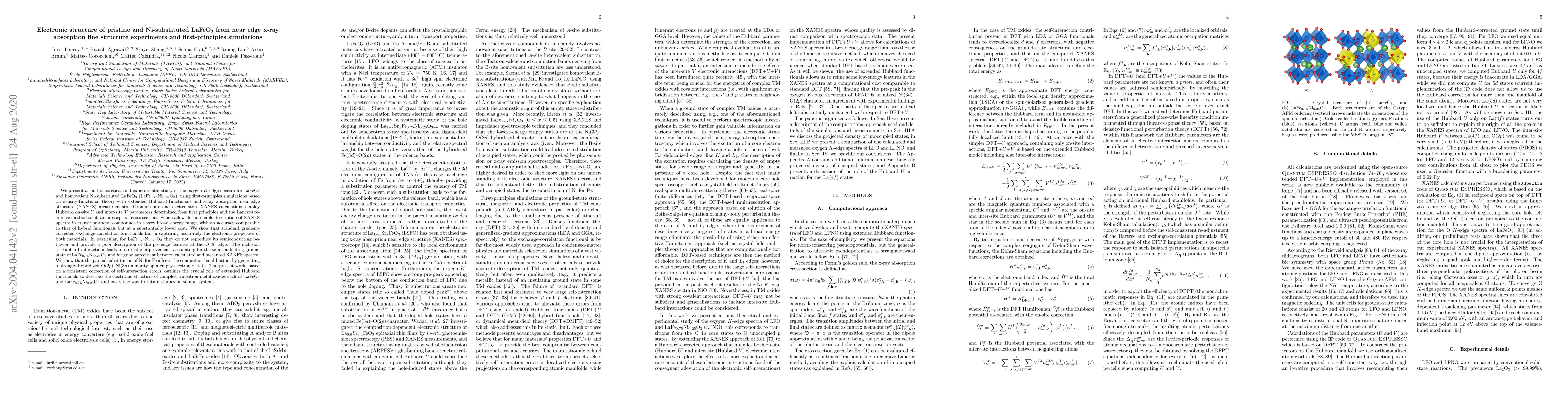 We present a joint theoretical and experimental study of the oxygen $K$-edge spectra for LaFeO$_3$ and homovalent Ni-substituted LaFeO$_3$ (LaFe$_{0.75}$Ni$_{0.25}$O$_3$), using first-principles simulations based on density-functional theory with extended Hubbard functionals and x-ray absorption near edge structure (XANES) measurements. Ground-state and excited-state XANES calculations employ Hubbard on-site $U$ and inter-site $V$ parameters determined from first principles and the Lanczos recursive method to obtain absorption cross sections, which allows for a reliable description of XANES spectra in transition-metal compounds in a very broad energy range, with an accuracy comparable to that of hybrid functionals but at a substantially lower cost. We show that standard gradient-corrected exchange-correlation functionals fail in capturing accurately the electronic properties of both materials. In particular, for LaFe$_{0.75}$Ni$_{0.25}$O$_3$ they do not reproduce its semiconducting behaviour and provide a poor description of the pre-edge features at the O $K$ edge. The inclusion of Hubbard interactions leads to a drastic improvement, accounting for the semiconducting ground state of LaFe$_{0.75}$Ni$_{0.25}$O$_3$ and for a good agreement between calculated and measured XANES spectra. We show that the partial substitution of Fe for Ni affects the conduction-band bottom by generating a strongly hybridized O($2p$)-Ni($3d$) minority-spin empty electronic state. The present work, based on a consistent correction of self-interaction errors, outlines the crucial role of extended Hubbard functionals to describe the electronic structure of complex transition-metal oxides such as LaFeO$_3$ and LaFe$_{0.75}$Ni$_{0.25}$O$_3$ and paves the way to future studies on similar systems.