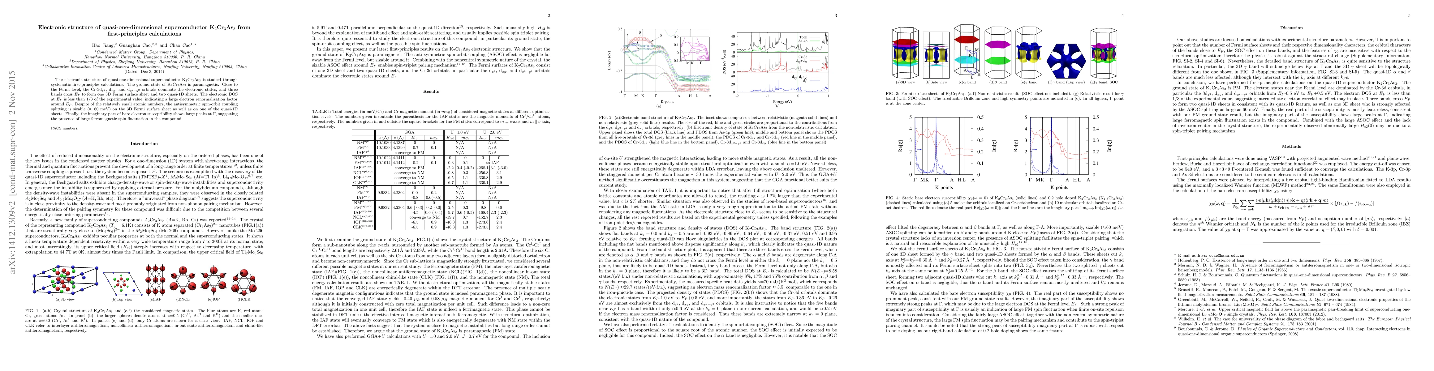 This study uses first-principles calculations to analyze the electronic structure of the quasi-one-dimensional superconductor K$_2$Cr$_3$As$_3$, revealing a paramagnetic ground state near ferromagnetic instability. The analysis shows significant spin-orbit coupling and large ferromagnetic spin fluctuations, despite the compound's relatively small atomic numbers.