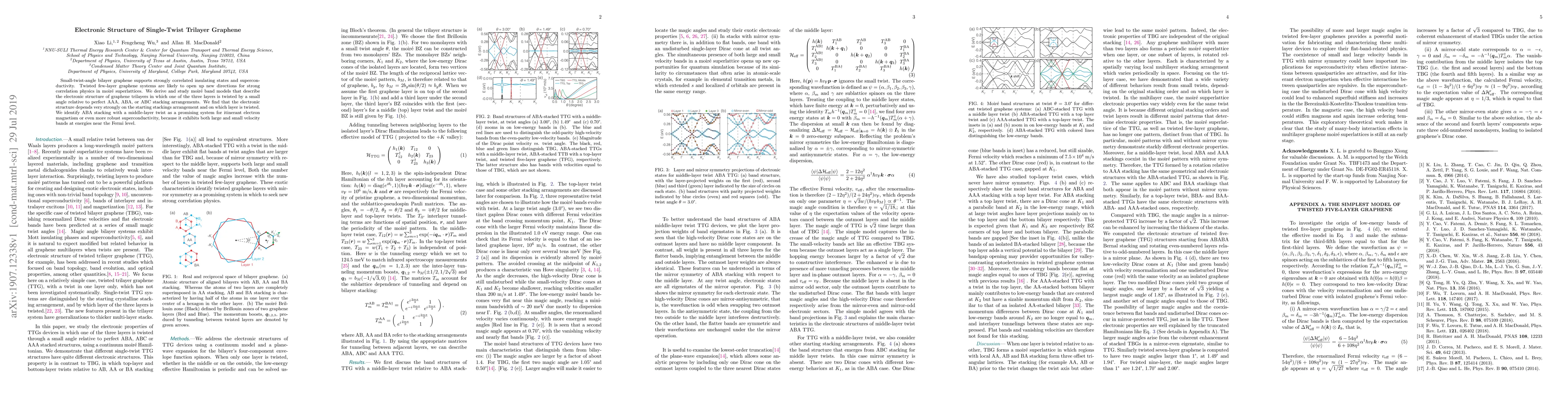 This paper investigates the electronic structure of single-twist trilayer graphene, revealing that the system's properties strongly depend on the initial stacking arrangement and the twisted layer. ABA stacking with a middle-layer twist shows potential for itinerant electron magnetism or superconductivity due to its unique electronic band characteristics.