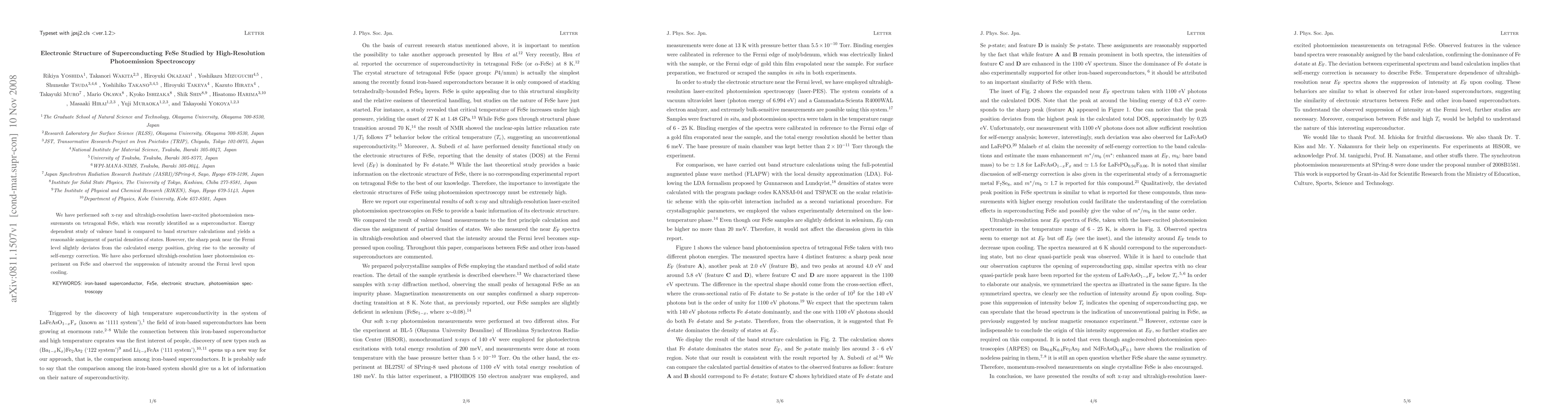This study uses high-resolution photoemission spectroscopy to investigate the electronic structure of superconducting FeSe, revealing discrepancies between observed and calculated densities of states near the Fermi level and noting intensity suppression around the Fermi level upon cooling.