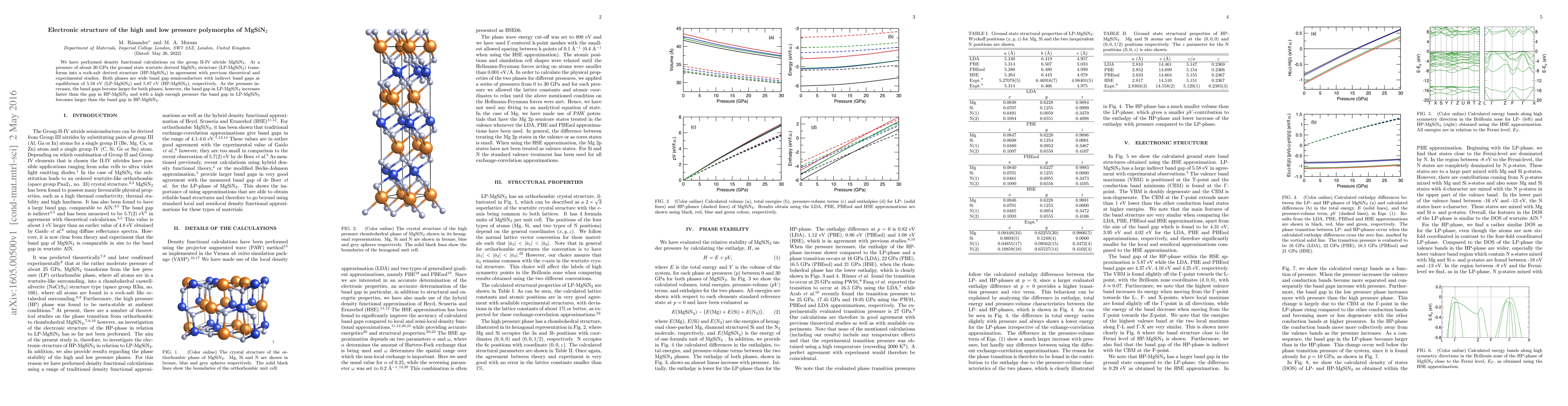 We have performed density functional calculations on the group II-IV nitride MgSiN$_{2}$. At a pressure of about 20~GPa the ground state wurtzite derived MgSiN$_{2}$ structure (LP-MgSiN$_{2}$) transforms into a rock-salt derived structure (HP-MgSiN$_{2}$) in agreement with previous theoretical and experimental studies. Both phases are wide band gap semiconductors with indirect band gaps at equilibrium of 5.58 eV (LP-MgSiN$_{2}$) and 5.87 eV (HP-MgSiN$_{2}$), respectively. As the pressure increases, the band gaps become larger for both phases, however, the band gap in LP-MgSiN$_{2}$ increases faster than the gap in HP-MgSiN$_{2}$ and with a high enough pressure the band gap in LP-MgSiN$_{2}$ becomes larger than the band gap in HP-MgSiN$_{2}$.