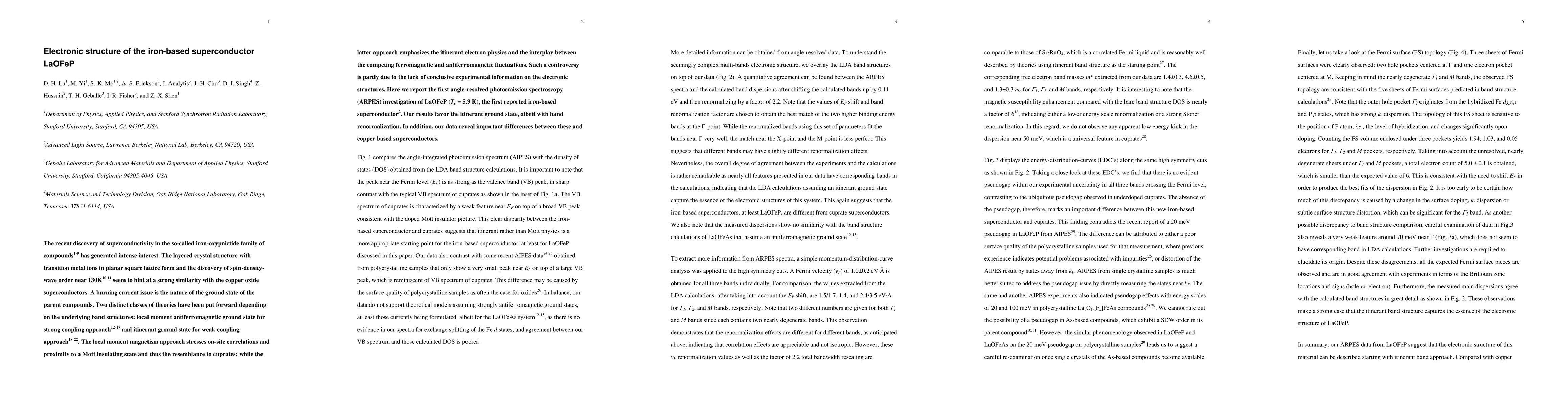 This paper reports the first angle-resolved photoemission spectroscopy (ARPES) study of the iron-based superconductor LaOFeP, finding evidence supporting an itinerant ground state over a local moment antiferromagnetic state. The study highlights differences between iron-oxypnictides and copper oxide superconductors.