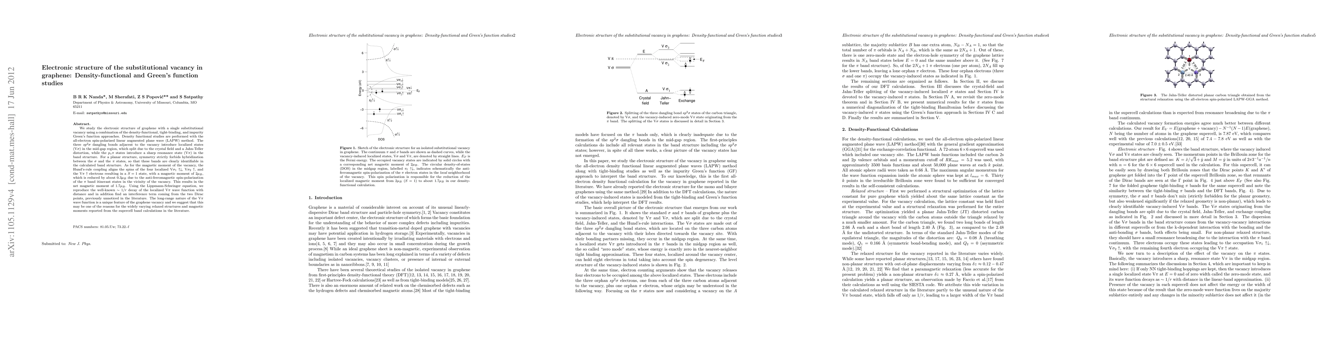 We study the electronic structure of graphene with a single substitutional vacancy using a combination of the density-functional, tight-binding, and impurity Green's function approaches. Density functional studies are performed with the all-electron spin-polarized linear augmented plane wave (LAPW) method. The three $sp^2 \sigma$ dangling bonds adjacent to the vacancy introduce localized states (V$\sigma$) in the mid-gap region, which split due to the crystal field and a Jahn-Teller distortion, while the $p_z \pi$ states introduce a sharp resonance state (V$\pi$) in the band structure. For a planar structure, symmetry strictly forbids hybridization between the $\sigma$ and the $\pi$ states, so that these bands are clearly identifiable in the calculated band structure. As for the magnetic moment of the vacancy, the Hund's-rule coupling aligns the spins of the four localized V$\sigma_1 \uparrow \downarrow$, V$\sigma_2 \uparrow $, and the V$\pi \uparrow$ electrons resulting in a S=1 state, with a magnetic moment of $2 \mu_B$, which is reduced by about $0.3 \mu_B$ due to the anti-ferromagnetic spin-polarization of the $\pi$ band itinerant states in the vicinity of the vacancy. This results in the net magnetic moment of $1.7 \mu_B$. Using the Lippmann-Schwinger equation, we reproduce the well-known $\sim 1/r$ decay of the localized V$\pi$ wave function with distance and in addition find an interference term coming from the two Dirac points, previously unnoticed in the literature. The long-range nature of the V$\pi$ wave function is a unique feature of the graphene vacancy and we suggest that this may be one of the reasons for the widely varying relaxed structures and magnetic moments reported from the supercell band calculations in the literature.