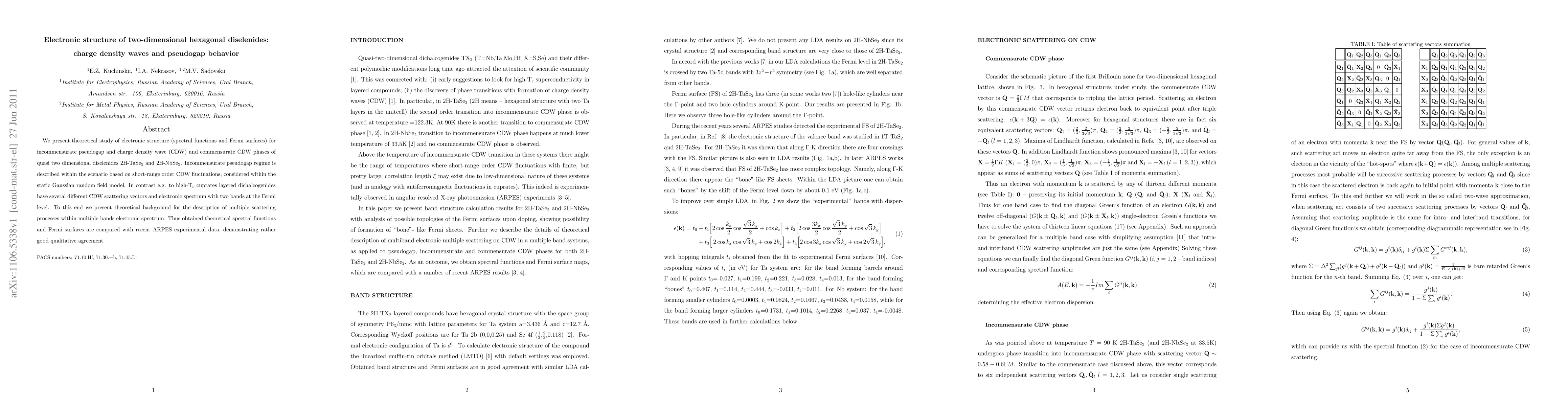This paper theoretically investigates the electronic structure of quasi two-dimensional hexagonal diselenides (2H-TaSe2 and 2H-NbSe2) in various phases, including incommensurate pseudogap and charge density wave (CDW) states. The study provides a theoretical framework for multiple scattering processes in multiple bands, comparing results with recent ARPES data and showing good qualitative agreement.