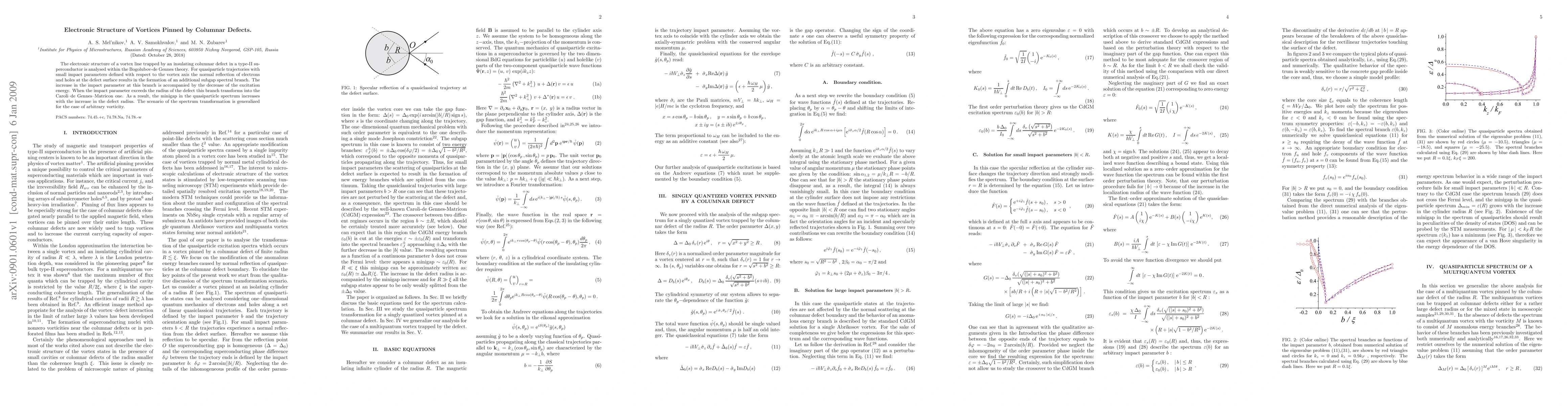 The electronic structure of a vortex line trapped by an insulating columnar defect in a type-II superconductor is analysed within the Bogolubov-de Gennes theory. For quasiparticle trajectories with small impact parameters defined with respect to the vortex axis the normal reflection of electrons and holes at the defect surface results in the formation of an additional subgap spectral branch. The increase in the impact parameter at this branch is accompanied by the decrease of the excitation energy. When the impact parameter exceeds the radius of the defect this branch transforms into the Caroli--de Gennes--Matricon one. As a result, the minigap in the quasiparticle spectrum increases with the increase in the defect radius. The scenario of the spectrum transformation is generalized for the case of arbitrary vorticity.