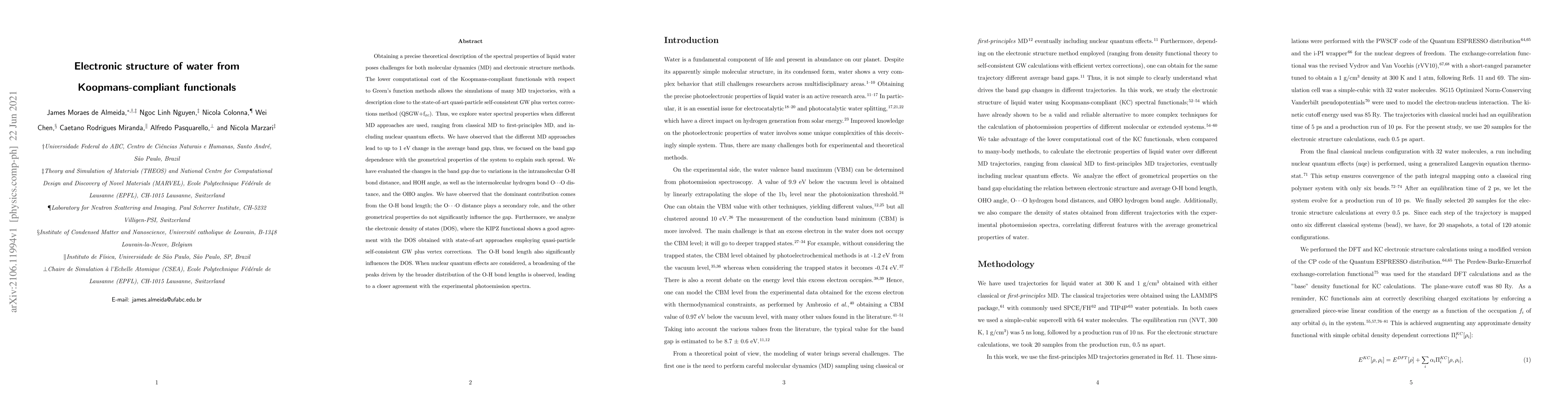 Obtaining a precise theoretical description of the spectral properties of liquid water poses challenges for both molecular dynamics (MD) and electronic structure methods. The lower computational cost of the Koopmans-compliant functionals with respect to Green's function methods allows the simulations of many MD trajectories, with a description close to the state-of-art quasi-particle self-consistent GW plus vertex corrections method (QSGW+f$_{xc}$). Thus, we explore water spectral properties when different MD approaches are used, ranging from classical MD to first-principles MD, and including nuclear quantum effects. We have observed that the different MD approaches lead to up to 1 eV change in the average band gap, thus, we focused on the band gap dependence with the geometrical properties of the system to explain such spread. We have evaluated the changes in the band gap due to variations in the intramolecular O-H bond distance, and HOH angle, as well as the intermolecular hydrogen bond O$\cdot\cdot\cdot$O distance, and the OHO angles. We have observed that the dominant contribution comes from the O-H bond length; the O$\cdot\cdot\cdot$O distance plays a secondary role, and the other geometrical properties do not significantly influence the gap. Furthermore, we analyze the electronic density of states (DOS), where the KIPZ functional shows a good agreement with the DOS obtained with state-of-art approaches employing quasi-particle self-consistent GW plus vertex corrections. The O-H bond length also significantly influences the DOS. When nuclear quantum effects are considered, a broadening of the peaks driven by the broader distribution of the O-H bond lengths is observed, leading to a closer agreement with the experimental photoemission spectra.