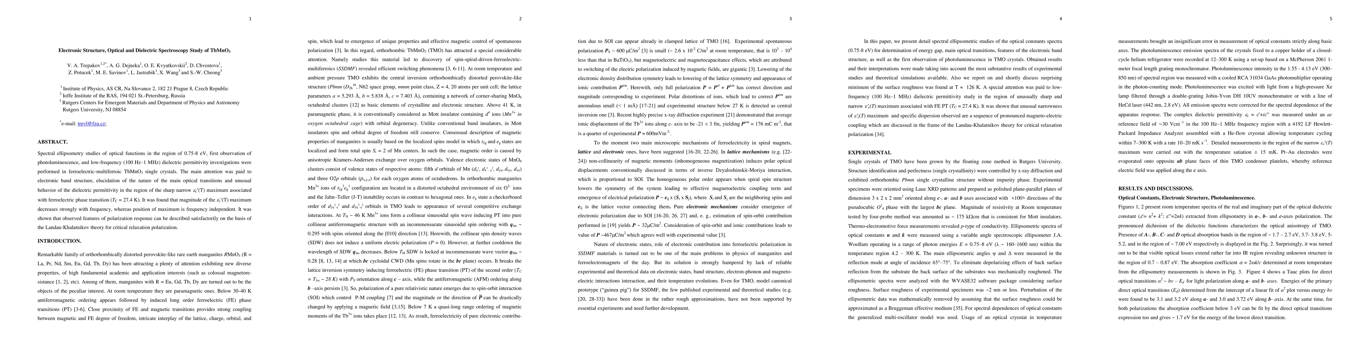 Researchers studied TbMnO3 crystals using spectroscopy techniques to investigate their electronic structure, optical properties, and dielectric behavior, revealing unusual features of the material's ferroelectric phase transition.