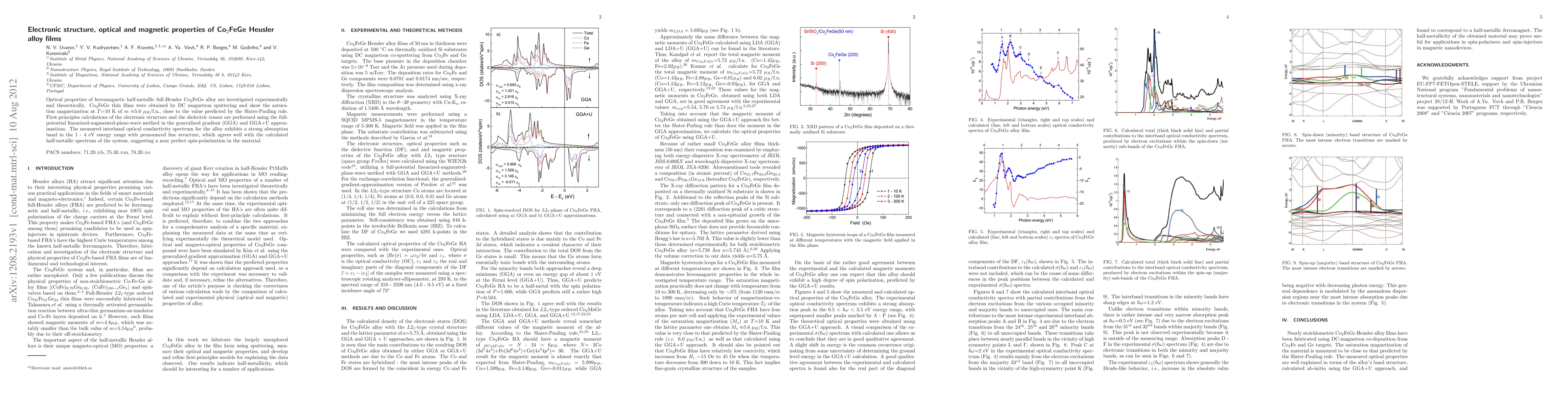This study investigates the electronic structure, optical, and magnetic properties of Co$_{2}$FeGe Heusler alloy films, revealing strong absorption in the 1-4 eV range and near perfect spin-polarization, confirmed by both experimental and theoretical analyses. The films exhibit saturation magnetization close to the predicted value, indicating their potential for spintronic applications.