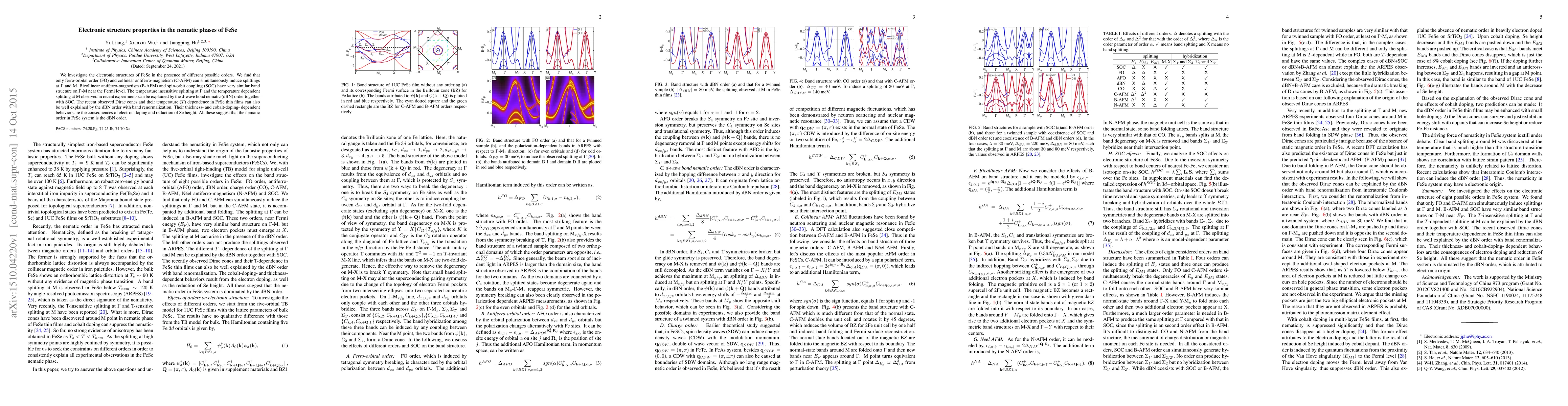 This paper investigates the electronic structures of FeSe under various orders, concluding that only ferro-orbital order and collinear antiferro-magnetism can induce specific splittings. The observed nematic properties, including temperature-dependent splittings and Dirac cone behaviors, are best explained by a d-wave bond nematic order in FeSe.