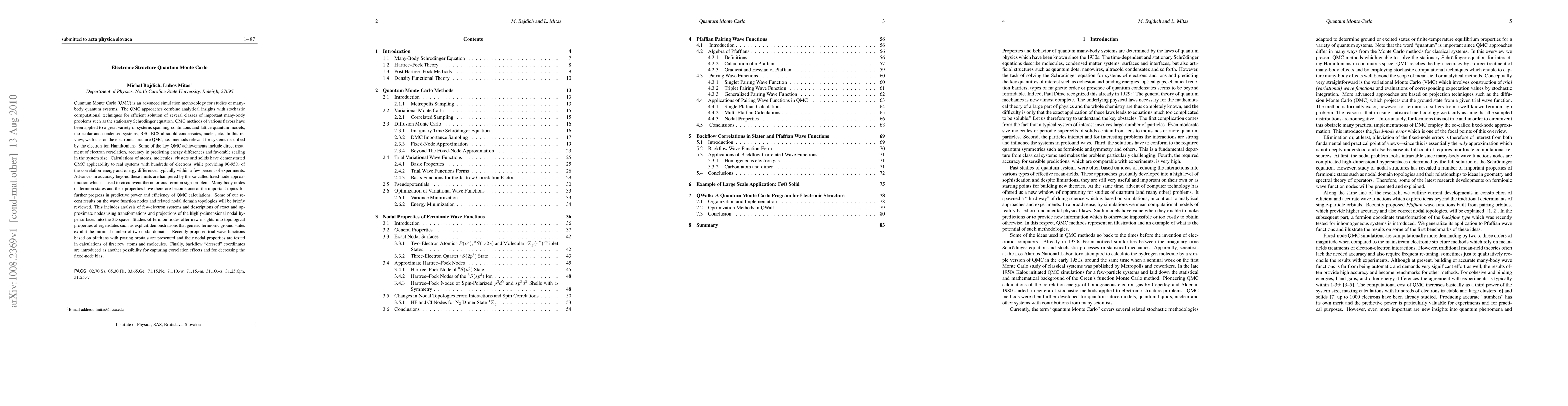 This review discusses advanced Quantum Monte Carlo (QMC) methods for electronic structure, highlighting their ability to treat electron correlation and predict energy differences with high accuracy. It explores the challenges posed by the fixed-node approximation and recent advances in understanding fermion nodes, including new trial wave functions based on Pfaffians and backflow coordinates to improve accuracy.