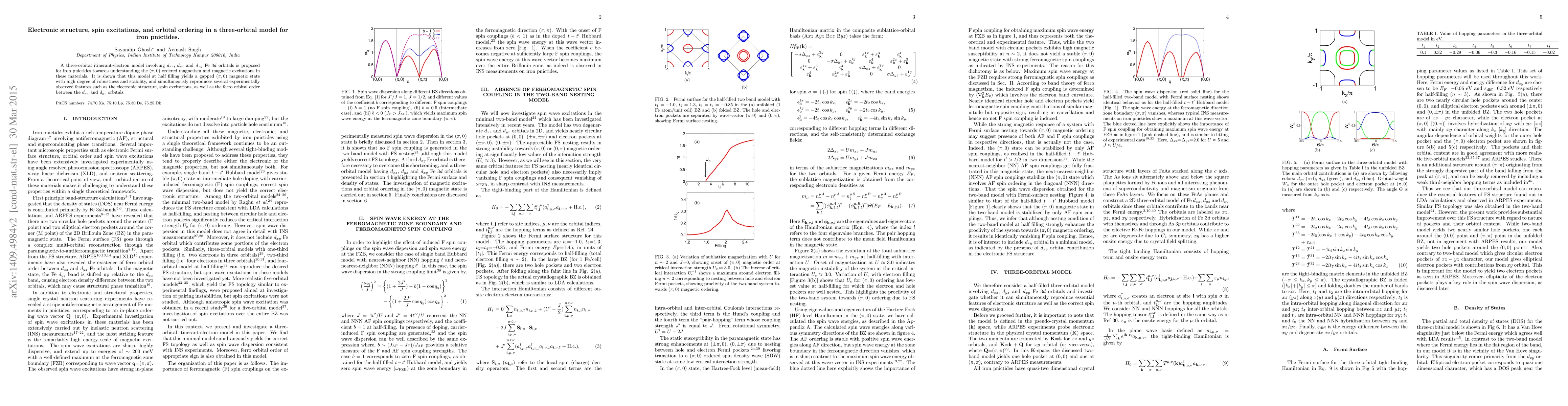 This paper proposes a three-orbital model for iron pnictides, demonstrating that it can reproduce the electronic structure, spin excitations, and orbital ordering observed experimentally. The model predicts a stable (\pi,0) magnetic state with a gap, showing robustness and alignment with experimental findings.