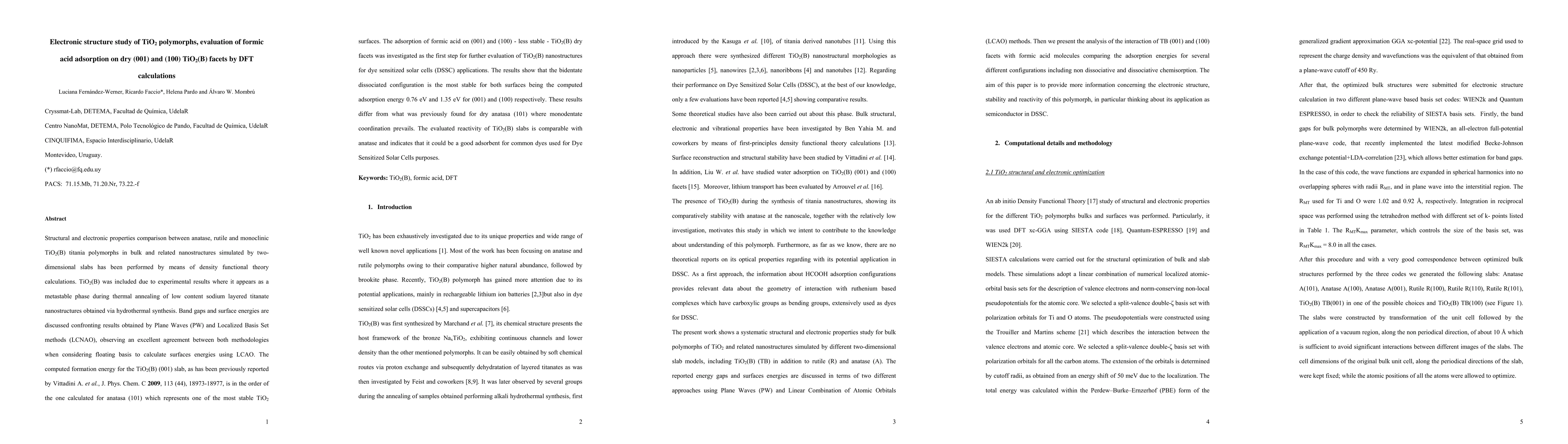 This study compares the electronic structure of anatase, rutile, and monoclinic TiO2(B) polymorphs using DFT calculations, finding TiO2(B) (001) to be stable and comparable to anatase (101). Formic acid adsorption on TiO2(B) (001) and (100) facets shows bidentate dissociation as the most stable configuration, suggesting TiO2(B) could be a good adsorbent for dye-sensitized solar cells.