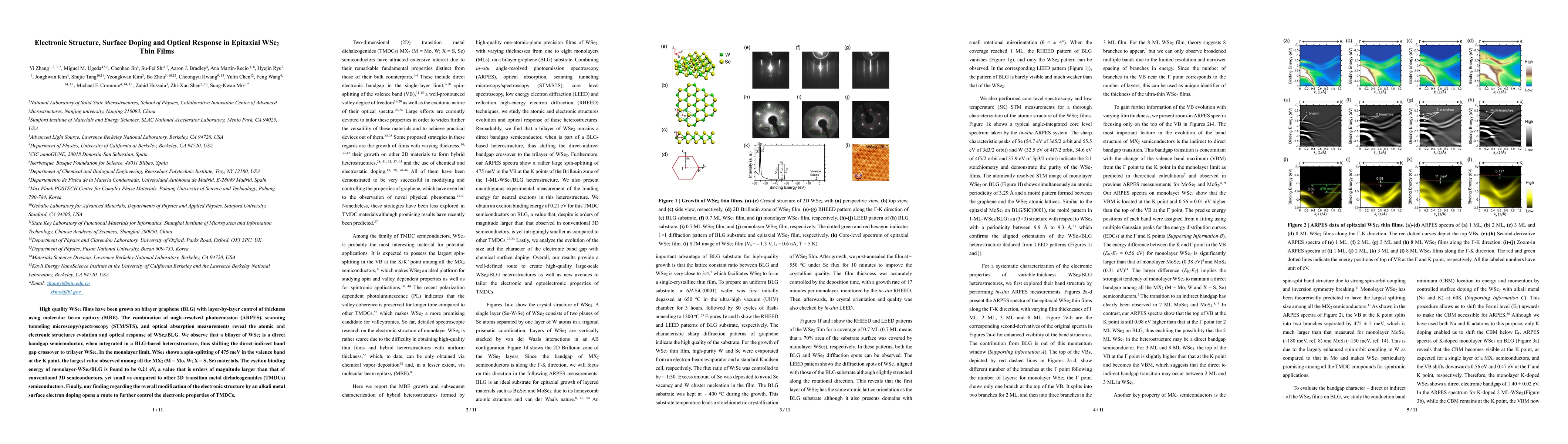 High-quality WSe2 films on bilayer graphene grown via MBE exhibit direct bandgap transitions and large spin-splitting, with monolayer WSe2 showing an exciton binding energy much higher than conventional 3D semiconductors, while surface doping can modify its electronic structure.