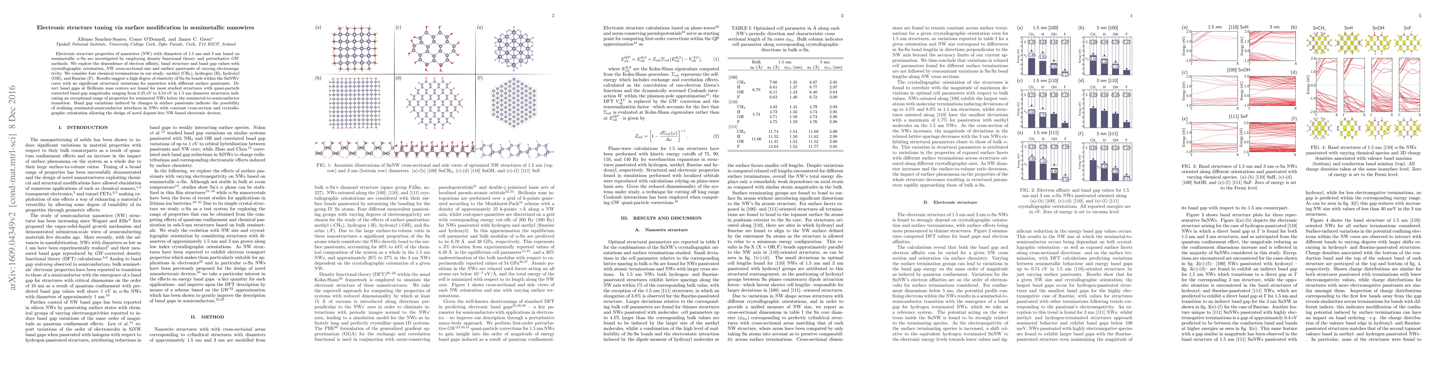 Electronic structure properties of nanowires (NW) with diameters of 1.5 nm and 3 nm based on semimetallic $\alpha$-Sn are investigated by employing density functional theory and perturbative $GW$ methods. We explore the dependence of electron affinity, band structure and band gap values with crystallographic orientation, NW cross-sectional size and surface passivants of varying electronegativity. We consider four chemical terminations in our study: methyl ($\rm{CH_3}$), hydrogen ($\rm{H}$), hydroxyl ($\rm{OH}$), and fluorine ($\rm{F}$). Results suggest a high degree of elasticity of Sn-Sn bonds within the SnNWs' cores with no significant structural variations for nanowires with different surface passivants. Direct band gaps at Brillouin zone centers are found for most studied structures with quasi-particle corrected band gap magnitudes ranging from 0.25 eV to 3.54 eV in 1.5 nm diameter structures indicating an exceptional range of properties for semimetal NWs below the semimetal-to-semiconductor transition. Band gap variations induced by changes in surface passivants indicate the possibility of realizing semimetal-semiconductor interfaces in NWs with constant cross-section and crystallographic orientation allowing the design of novel dopant-free NW-based electronic devices.