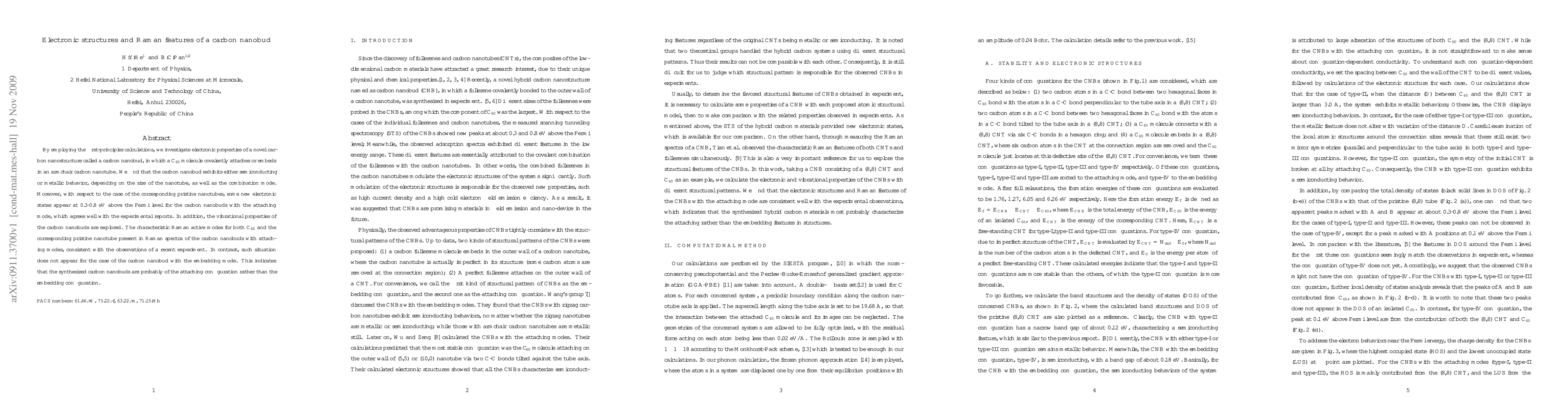 By employing the first-principles calculations, we investigate electronic properties of a novel carbon nanostructure called a carbon nanobud, in which a $C_{60}$ molecule covalently attaches or embeds in an armchair carbon nanotube. We find that the carbon nanobud exhibits either semiconducting or metallic behavior, depending on the size of the nanotube, as well as the combination mode. Moreover, with respect to the case of the corresponding pristine nanotubes, some new electronic states appear at 0.3-0.8 eV above the Fermi level for the carbon nanobuds with the attaching mode, which agrees well with the experimental reports. In addition, the vibrational properties of the carbon nanobuds are explored. The characteristic Raman active modes for both $C_{60}$ and the corresponding pristine nanotube present in Raman spectra of the carbon nanobuds with attaching modes, consistent with the observations of a recent experiment. In contrast, such situation does not appear for the case of the carbon nanobud with the embedding mode. This indicates that the synthesized carbon nanobuds are probably of the attaching configuration rather than the embedding configuration.