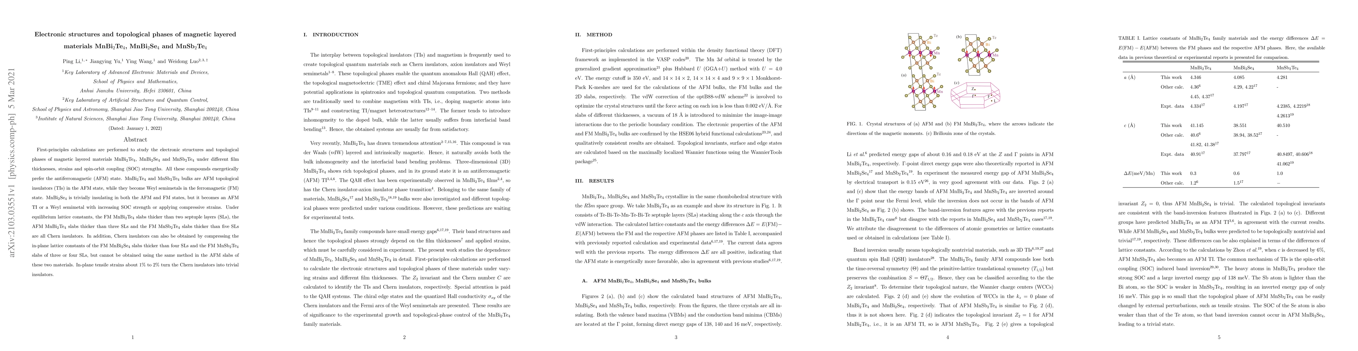This paper investigates the electronic structures and topological phases of magnetic layered materials MnBi2Te4, MnBi2Se4, and MnSb2Te4 using first-principles calculations. It finds that MnBi2Te4 and MnSb2Te4 are AFM topological insulators in their bulk AFM state, while MnBi2Se4 is trivially insulating but can become an AFM topological insulator or Weyl semimetal with increased spin-orbit coupling or compressive strains.
