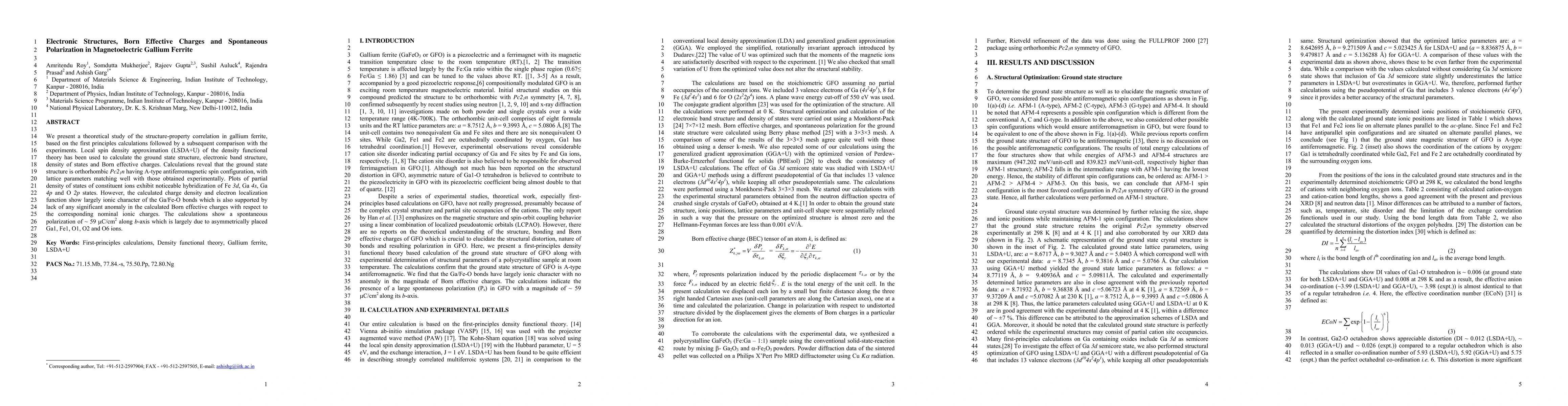 This study uses first-principles calculations to investigate the electronic structure and spontaneous polarization in gallium ferrite, revealing an orthorhombic ground state with A-type antiferromagnetic spin configuration. The analysis shows significant hybridization and ionic character in Ga/Fe-O bonds, and predicts a spontaneous polarization of ~59 microC/cm^2.