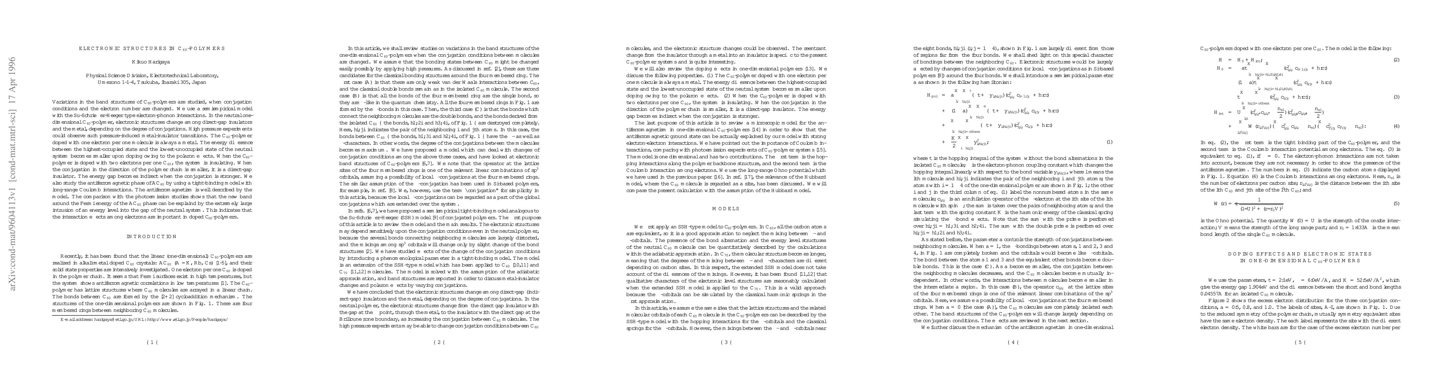 Variations in the band structures of C60-polymers are studied, when conjugation conditions and the electron number are changed. We use a semiempirical model with the Su-Schrieffer-Heeger type electron-phonon interactions. In the neutral one-dimensional C60-polymer, electronic structures change among direct-gap insulators and the metal, depending on the degree of conjugations. High pressure experiments could observe such pressure-induced metal-insulator transitions. The C60-polymer doped with one electron per one molecule is always a metal. The energy difference between the highest-occupied state and the lowest-unoccupied state of the neutral system becomes smaller upon doping owing to the polaron effects. When the C60-polymer is doped with two electrons per one C60, the system is insulating. When the conjugation in the direction of the polymer chain is smaller, it is a direct-gap insulator. The energy gap becomes indirect when the conjugation is stronger. We also study the antiferromagnetic phase of AC60 by using a tight-binding model with long-range Coulomb interactions. The antiferromagnetism is well described by the model. The comparison with the photoemission studies shows that the new band around the Fermi energy of the AC60 phase can be explaind by the extremely large intrusion of an energy level into the gap of the neutral system. This indicates that the interaction effects among electrons are important in doped C60-polymers.