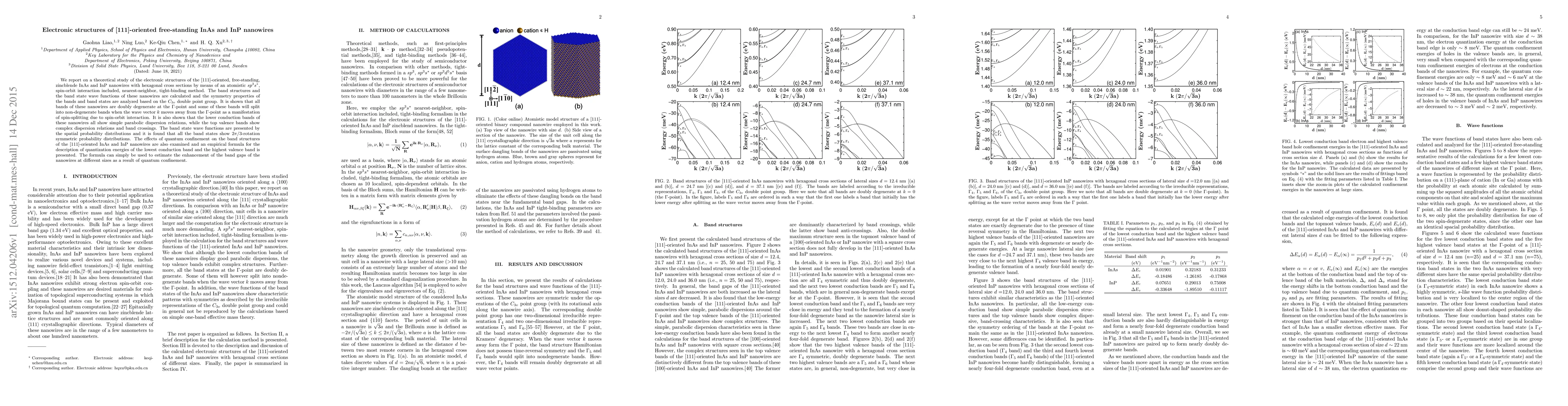 This paper presents a theoretical study of the electronic structures of [111]-oriented InAs and InP nanowires using a tight-binding method, revealing double degeneracy of bands at the Γ-point and spin-splitting effects. An empirical formula for estimating quantum confinement-induced band gap enhancements is also provided.
