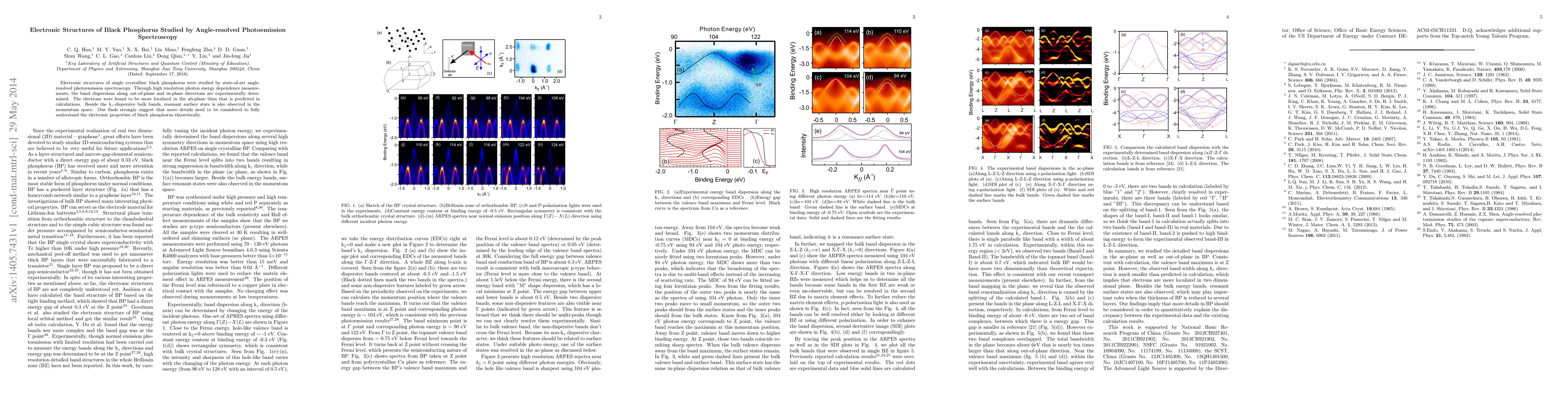 Electronic structures of single crystalline black phosphorus were studied by state-of-art angleresolved photoemission spectroscopy. Through high resolution photon energy dependence measurements, the band dispersions along out-of-plane and in-plane directions are experimentally determined. The electrons were found to be more localized in the ab-plane than that is predicted in calculations. Beside the kz-dispersive bulk bands, resonant surface state is also observed in the momentum space. Our finds strongly suggest that more details need to be considered to fully understand the electronic properties of black phosphorus theoretically.