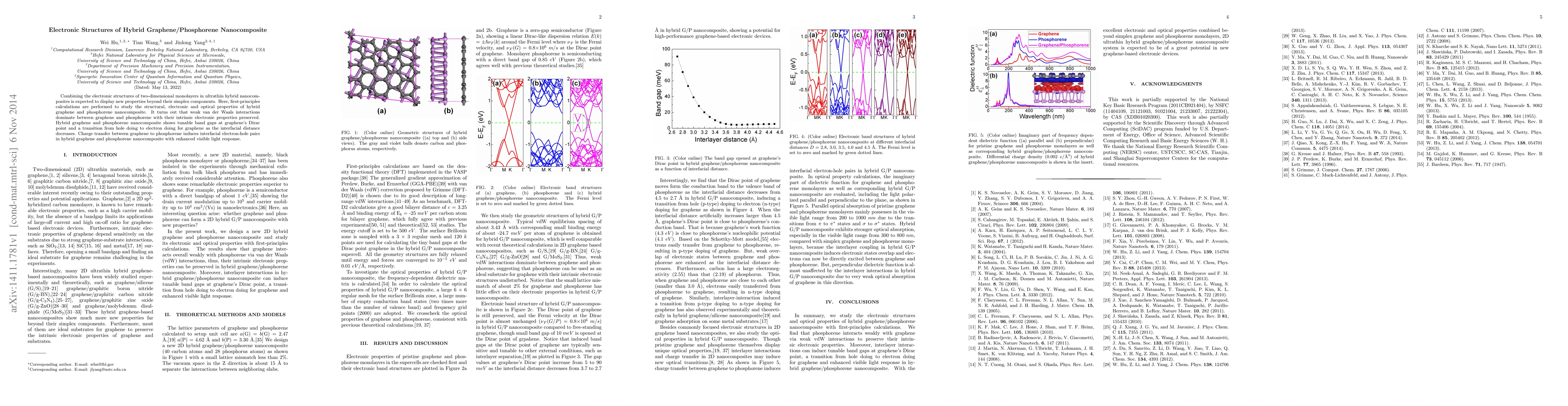 This research explores the electronic structures of hybrid graphene/phosphorene nanocomposites, revealing tunable band gaps and enhanced visible light response due to weak van der Waals interactions and charge transfer, while preserving the intrinsic electronic properties of graphene and phosphorene.