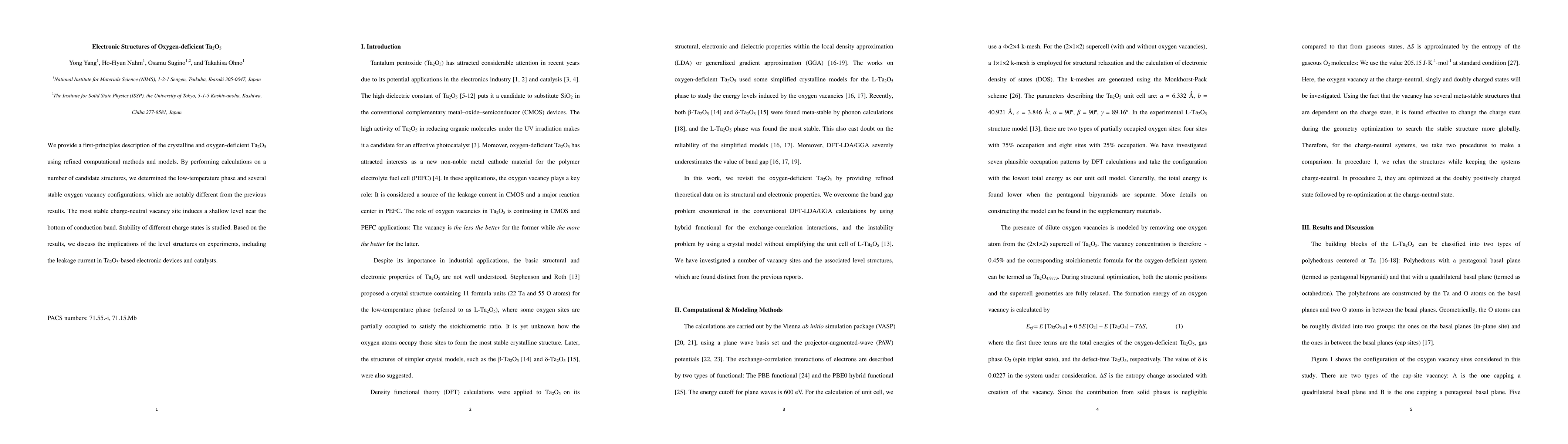 This paper uses first-principles computational methods to investigate the electronic structures of oxygen-deficient Ta2O5, identifying the most stable phase and vacancy configurations. The study reveals a shallow level near the conduction band due to the most stable charge-neutral vacancy, with implications for leakage current in Ta2O5-based devices and catalysts.